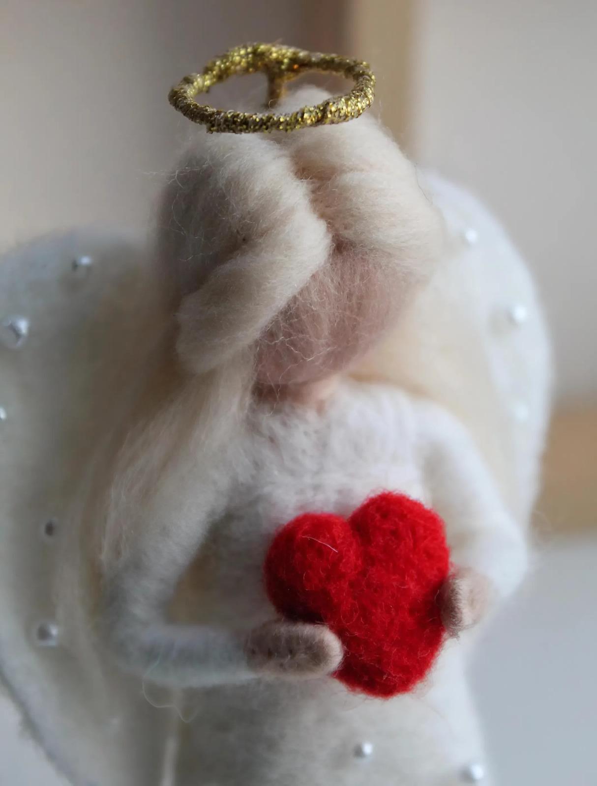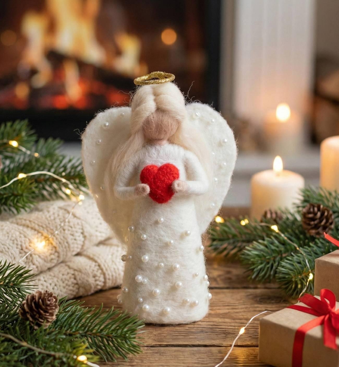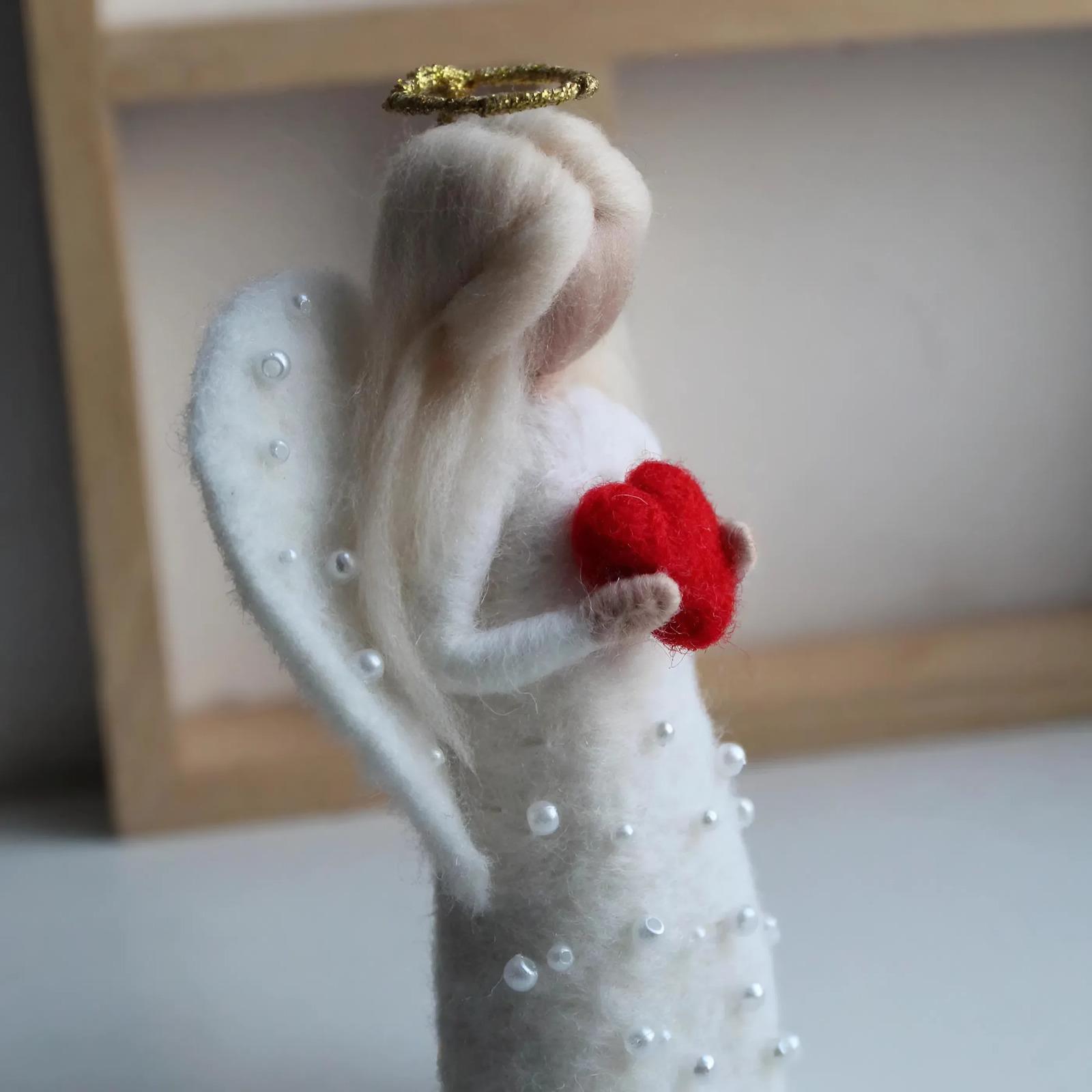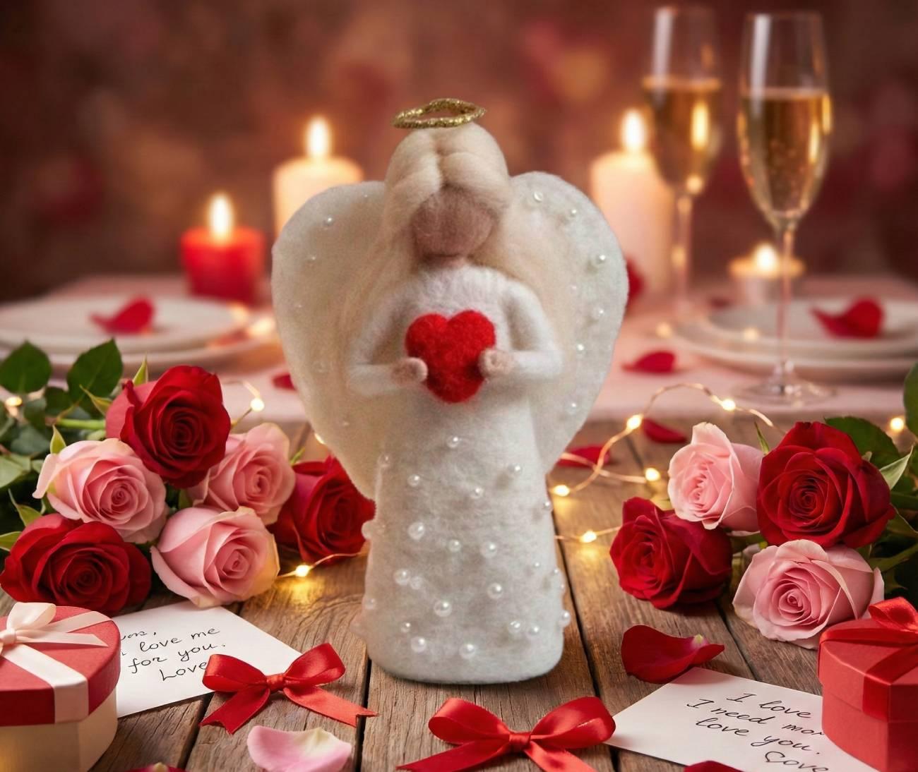 Особливості: валентинки ляльки ручної роботи – авторська валентинка-ангелик ручної роботи – це ніжний символ кохання, створений з теплом і душею. Сувенірна лялька виконана у техніці валяння з натуральної вовни та закріплена на витонченій дерев’яній підставці, що надає виробу стабільності й завершеного вигляду. Білявий ангелик висотою до 13 см зачаровує з першого погляду: довге світле волосся м’яко обрамляє образ, біла сукня оздоблена намистинами під перли підкреслює ніжність, а легкі білі крила створюють відчуття чистоти та світла. Золотистий німб з дроту додає ляльці казкового шарму. У руках ангелик тримає червоне сердечко – головний символ щирих почуттів і любові. Завдяки компактному розміру лялька ідеально підійде для розміщення на полиці, столі або тумбі, стаючи стильним акцентом інтер’єру та щоденним нагадуванням про теплі емоції. Ця авторська лялька-валентинка стане зворушливим подарунком до Дня святого Валентина, річниці чи просто як знак уваги для коханої людини – подарунком, що говорить про почуття без слів.