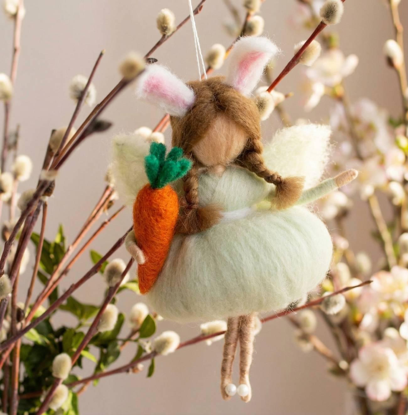 Особливості: ляльки валяння вовни – дитячі ляльки на гойдалках – міні лялька своїми руками невеликого розміру до 14 см – сувенір підвіска. Дитяча лялька іграшкова виконана з вовни мериноса в милому образі на Великдень – миле маленьке дівчисько янголятко у салатовій сукні з морквинкою. Лялька підвіска ангел з вовни зайка – валяння з вовни – лялька на Великдень позаду декорувана ангельськими крильцями. Лялька з вовни зроблена у вигляді сувеніру підвіски на ниточці. Лялька валяна з шерсті в зеленій пишній сукні можна використовувати як подарункові сувеніри підвіски вашим коханим і рідним. Маленькою із вовни лялькою зайка можна прикрашати дитячий інтер’єр, вішати в машині. Міні ляльки своїми руками – лялька з вовни – сувенір і талісман рідним дівчатам! Дитяча лялька – ляльки звалені з вовни порадують і зачарують не лише дитину, а й дорослу!