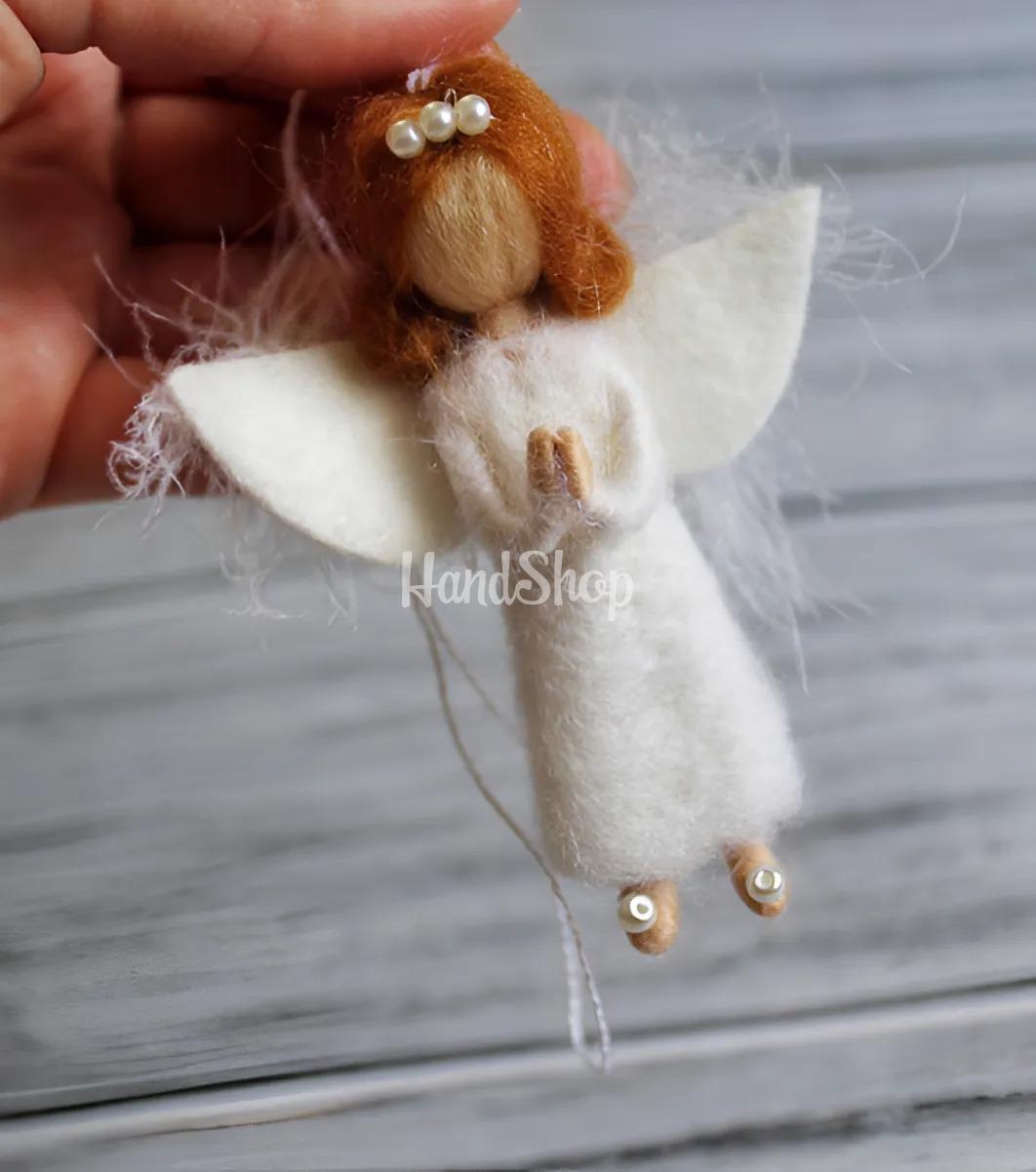 Особливості: маленькі іграшки ляльки – ляльки валяння вовни – міні лялечка своїми руками невеликого розміру до 9 см. Янгол лялька з крилами – сувенір підвіска в машину, дитячу кімнату, на ялинку. Янгол лялька рижий – новорічна лялька ангел з рижим волоссям з вовни виконана у милому святковому образі ангелочкана нитці. Лялька підвіска ангел з шерсті ангел – валяння з шерсті ляльки ззаду з ангельськими крильцями з пір’ям. Ляльки з шерсті – янгол лялька з шерсті рижий зроблена у вигляді сувеніру підвіски на ниточці на новорічну ялинку. Лялька валяна з вовни у білій сукні можна використовувати як подарункові сувеніри підвіски вашим коханим та рідним. Маленькою з вовни лялькою янголом рижим можна прикрашати ялинку та дитячий інтер’єр, вішати у машині. Міні ляльки своїми руками – лялька з вовни новорічна лялька ангел – сувенір і талісман рідним дівчатам! Дитяча лялька ангел – ангел лялька рижий – янгол ляльки звалені з вовни порадує і зачарує не лише дитину, а й дорослу!