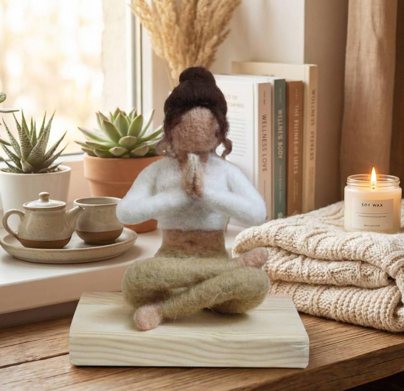Особливості: ляльки валяння вовни – дитячі ляльки сувеніри. Лялька своїми руками, яка любить йогу, медитацію. Лялька йогиня невеликого розміру до 12 см – сувенір лялька на день народження. Дитяча лялька йог виконана з шерсті мериноса в ніжному образі – мила дівчина на медитації в позі Намасте на дерев’яній підставці. В її ніжному образі відображається спокій і умиротворення: лялька сидить в позі Намасте, готова надихнути вас на медитацію та саморозвиток. Вбрання ляльки – біла кофтинка топ і бежево-коричневі штанці, підкреслюють її природну красу і гармонійність. Ця чарівна лялька йог стане чудовим сувеніром для жінок на свято весни, 8 березня, а також на день народження. Її унікальний дизайн і ручна робота роблять її ідеальним подарунком для тих, хто цінує красу та спокій, які йога приносить у наше життя. З нашою лялькою йогинею ви не просто даруєте сувенір — ви даруєте шматочок спокою і позитивної енергії, яка буде радувати кожен день. Оберіть цей унікальний подарунок, і нехай вона стане символом гармонії і щастя у вашому житті та житті ваших близьких.