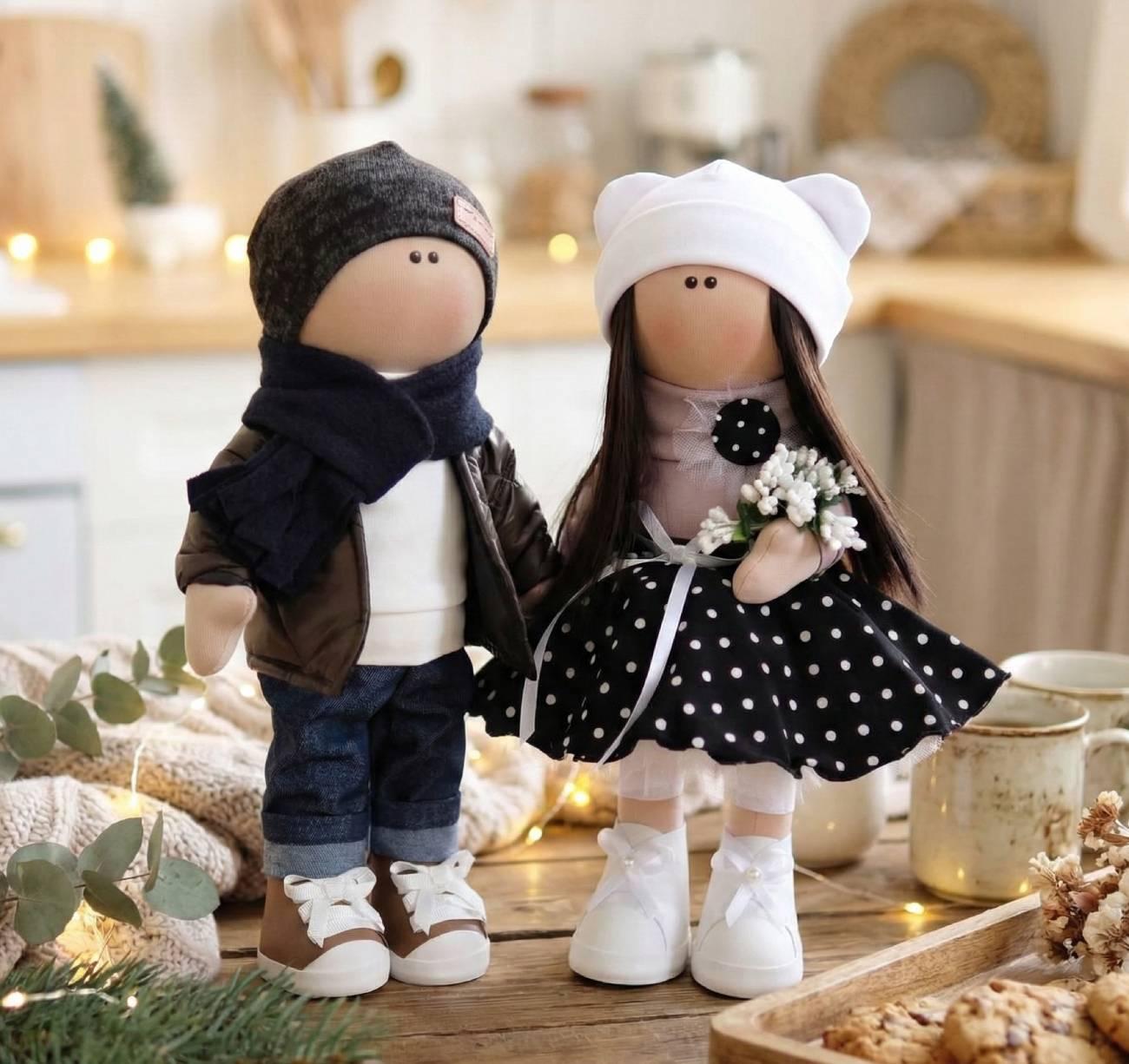 Особливості: ляльки весільні пари ляльки валентинки – авторські текстильні ляльки ручної роботи по 37 см в образі нареченого та нареченої. Весільна пара ляльок валентинки – це чарівний і романтичний подарунок для тих, хто святкує кохання! Авторські текстильні ляльки ручної роботи висотою 37 см в образі нареченого та нареченої – це не просто сувенір, а справжній витвір мистецтва, що відображає емоції та елегантність вашого свята. Ці весільні тільда ляльки виконані в коричневій кольоровій гамі, що надає їм теплої та затишної атмосфери. Їх стильний вигляд вишукано поєднується з романтичними образами: наречена в пишній спідниці в горох та гольфі, а наречений у кежуал образі – джинсах, білому светрі й коричневій курточці. Їх образи передають атмосферу ніжності та закоханості, що робить ці ляльки ідеальними для святкування Дня всіх закоханих або річниці весілля. Тільда ляльки стоять самостійно, що робить їх чудовим елементом декору на весільному святі чи в інтер’єрі вашого дому. Одяг на ляльках не знімається, що надає їм ще більше елегантності та довговічності. Вони стануть яскравим і незабутнім акцентом у будь-якому інтер’єрі, нагадуючи вам про важливі моменти у житті. Ці текстильні ляльки – відмінний подарунок для молодят, рідних та близьких, які хочуть отримати щось особливе і оригінальне. Вони можуть стати чудовим сувеніром з України, подарунком на День Святого Валентина або ж просто милою прикрасою, що символізує любов і гармонію. Ідеальний вибір для тих, хто хоче подарувати щось справді оригінальне, ніжне та зворушливе! На авторських текстильних ляльках, за вашим бажанням, ми напишемо імена Нареченого та Нареченої на дерев’яних сердечках!