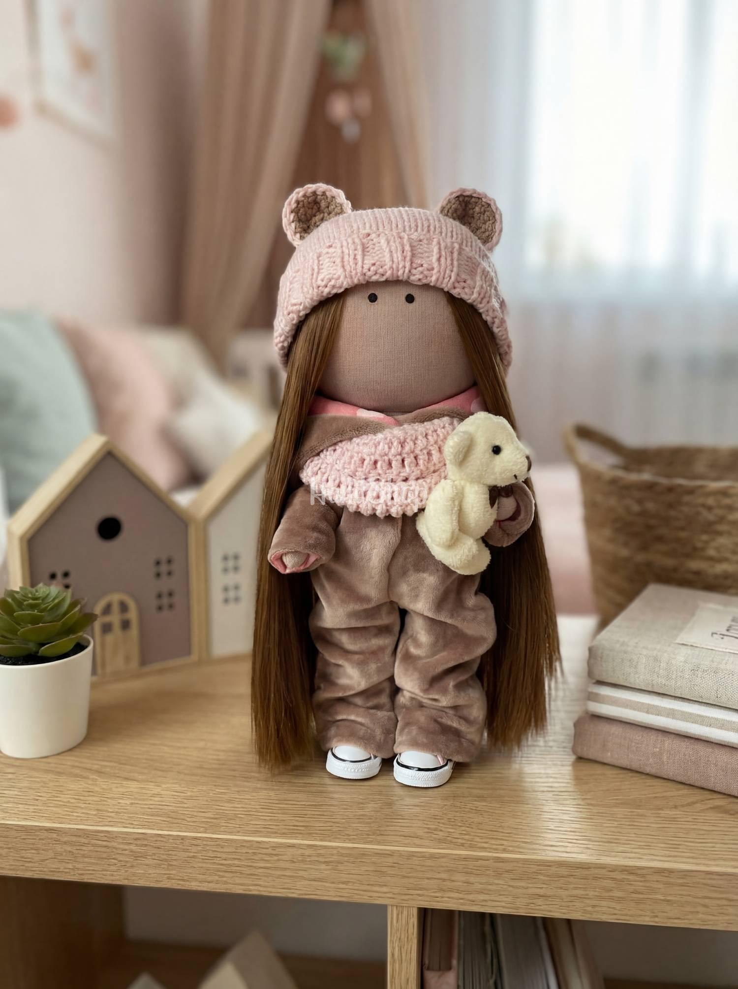 Особливості: інтер’єрна лялька дитяча з довгим волоссям – красива інтер’єрна лялька 27 см у трендовому осінньому луці милого ведмедика, яка підкорює серце з першого погляду! Текстильна лялька одягнена в м’який коричневий комбінезон, що додає їй неймовірного шарму та комфорту. В’язаний рожевий шалик і шапочка з милими вушками створюють атмосферу справжнього осіннього затишку, а її стиль вражає своїм актуальним виглядом. Авторська лялька має довге пряме каштанове волосся, яке можна розчісувати та змінювати зачіски – це додає ще більше можливостей для творчості та гри. У ручках лялька тримає пухнастого бежевого ведмедика – її найкращого друга та символ тепла й турботи. Цей м’який ведмедик стає частиною лялькового світу, що додає емоційної теплоті та магії. Оригінальний комбінезон і стильні чобітки знімаються, що дає можливість переодягати ляльку і робить її ще цікавішою для дітей. Можна створювати нові образи та придумувати безліч варіантів для гри. Сувенірна лялька може стояти та сидіти самостійно, без опори, що робить її ідеальною для будь-якого місця в інтер’єрі чи на дитячому столі. Ця текстильна інтер’єрна лялька ведмедик – чудовий подарунок для малечі або стильний елемент для вашого дому. Вона стане не лише предметом гри, а й частиною осіннього декору, який дарує затишок та позитив. Кожна деталь цієї ляльки створена з любов’ю і увагою до дрібниць, що робить її особливою та унікальною!