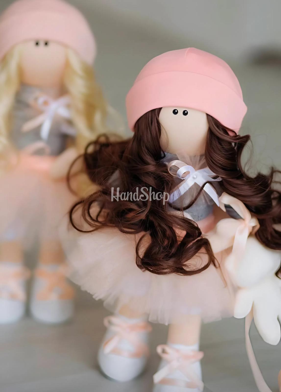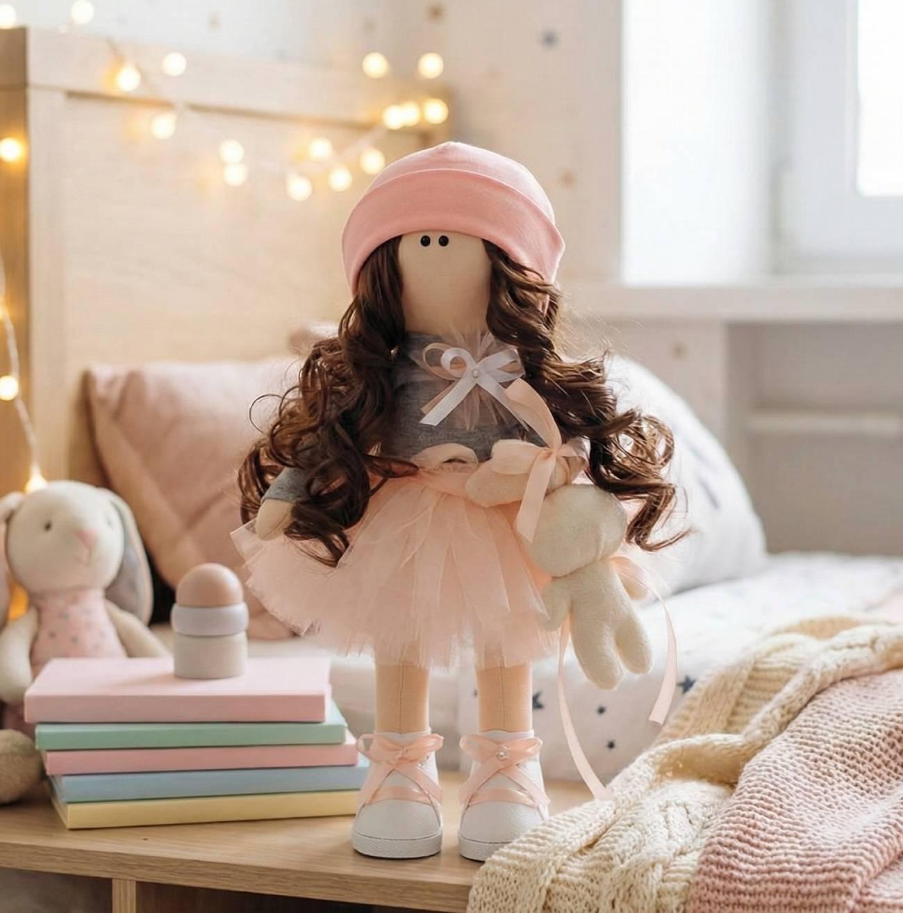 Особливості: лялька текстильна – велика красива авторська інтер’єрна лялька 37 см у милому ніжному образі маленької красуні з довгим кудрявим волоссям. Ця велика, ніжна текстильна лялька стане чудовою прикрасою для будь-якого інтер’єру, додаючи в нього атмосферу тепла та затишку. Авторська лялька висотою 37 см виконана в персиково-сірій кольоровій гамі, що додає їй особливого шарму і елегантності. Кожен елемент цієї ляльки тільда створено з любов’ю та увагою до деталей, що робить її унікальною. Лялька має довге кудряве каштанове волосся, яке можна розчісувати та заплітати. Шапочка, одяг і туфельки у кудрявої ляльки шатенки – все це старанно зшите і не знімається, що підвищує цілісність образу ляльки. Лялька тільда з легкістю тримає вертикальне положення, що дозволяє розмістити її в будь-якому місці вашого дому або офісу. Наша ігрова велика лялька тримає в руках маленьку м’яку іграшку ведмедика, що додає її образу ще більше милоти. Ця лялька стане чудовим подарунком для любителів унікальних ручних виробів, а також для тих, хто шукає стильну та оригінальну деталь для свого інтер’єру. Вона чудово підходить для дитячої кімнати, вітальні або як подарунок для близьких.