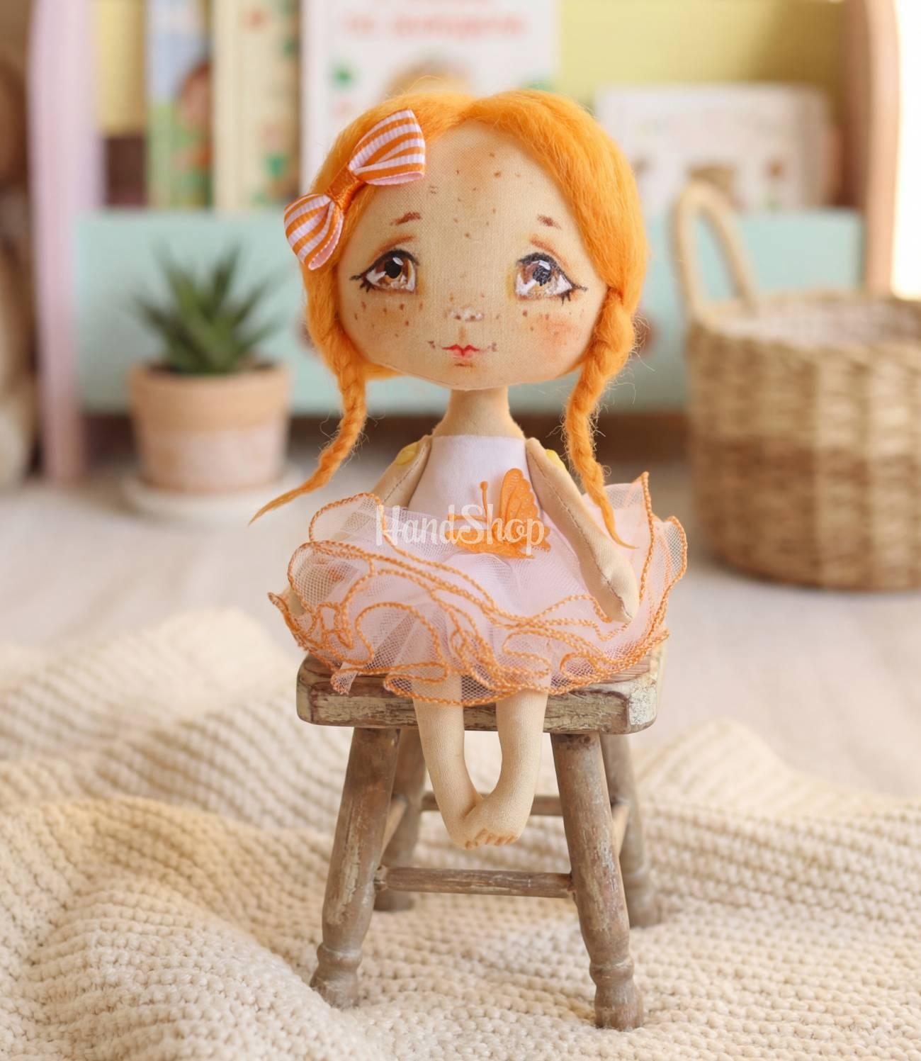 Особливості: дитячі ігрові сувенірні ляльки ручної роботи – міні лялька своїми руками зі зростом до 15 см. Дитяча лялька іграшкова виконана у образі рудоволосої дівчинки з ластовинням в білій пишеій сукні. Іграшкова лялька текстильна руда має розписне личко, зачіска дві косички, прикрашені великим бантом, що надає їй ще більшої привабливості. Унікальність цієї ляльки – у її дизайні: одяг біла сукня з помаранчевим метеликом не знімається, що робить її ще більш стійкою та зручною для гри. Ця маленька лялька з блискучими коричневими очима і ніжними рисами обличчя стане чудовим другом для вашої дитини. Вона ідеально підходить для маленьких ручок, і завдяки своїм компактним розмірам (всього 15 см) її можна взяти з собою в будь-яку подорож. Безпечна та м’яка, ця рудоволоса лялька створена для того, щоб стати справжнім другом у грі та повсякденному житті. Подаруйте вашій дитині цю чарівну ляльку і вона точно стане частиною найкращих моментів і найяскравіших фантазій!