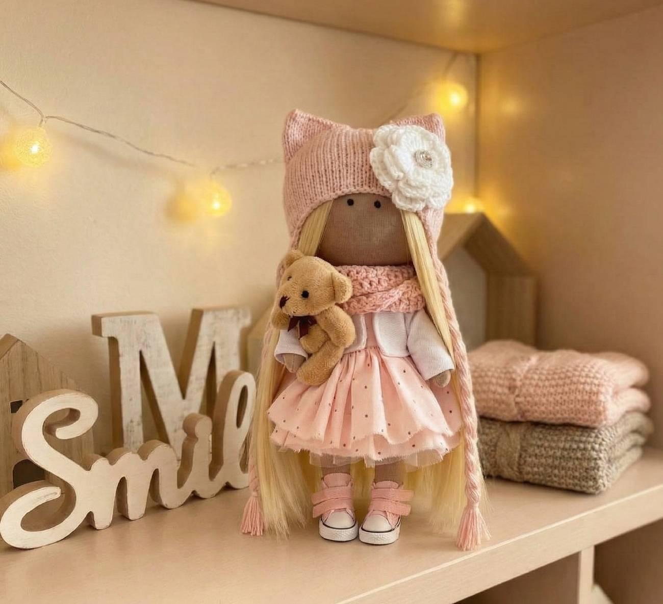 Особливості: інтер’єрна лялька дитяча – красива інтер’єрна лялька 27 см у пишній рожевій сукні. Зустрічайте чарівну авторську інтер’єрну ляльку 27 см у ніжному образі казкової принцеси! Вона одягнена в пишну рожеву сукню, милу в’язану шапочку з вушками котика та рожевий шарфик – кожна деталь створена з любов’ю. Лялька ігрова котик – довгим прямим волоссям з м’якою іграшкою ведмедиком в руках, що робить образ ще ніжнішим. У текстильній ляльці зайка одяг та взуття – знімається – тож ляльку можна переодягати. Текстильна інтер’єрна лялька котик стоїть та сидить самостійно, без опори! Наша авторська інтер’єрна лялька котик стане яскравою прикрасою дитячої кімнати або ідеальним святковим подарунком для ваших рідних та друзів. Наша інтер’єрна лялька в сукні – не просто прикраса кімнати, а ще й теплий подарунок, що передає любов та турботу. Створена вручну з любов’ю, лялька текстильна котик стане справжнім скарбом у будь-якій оселі.