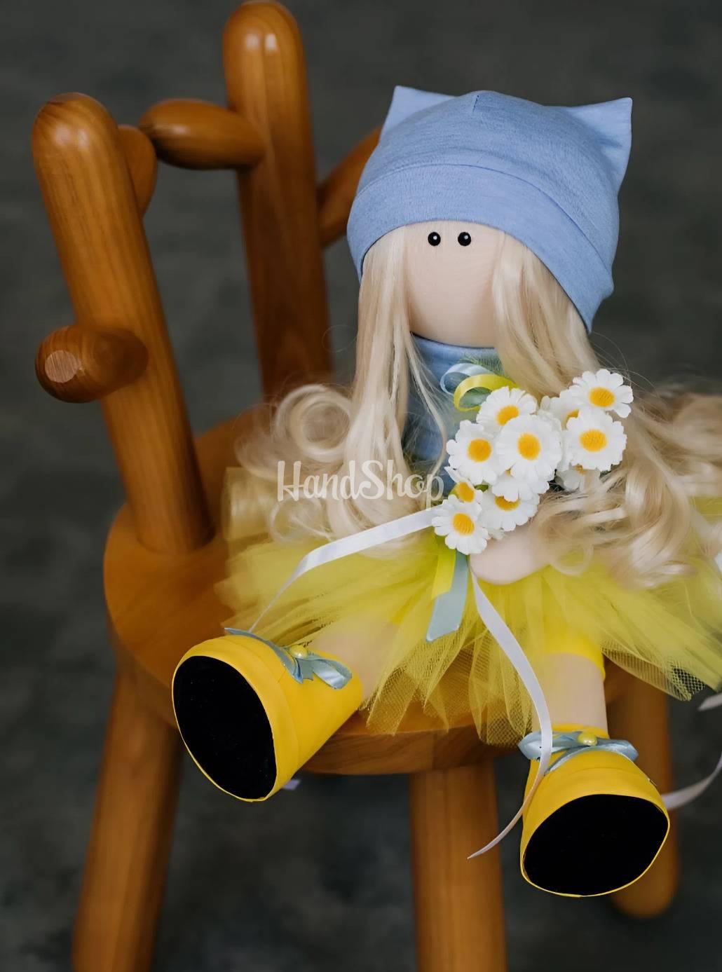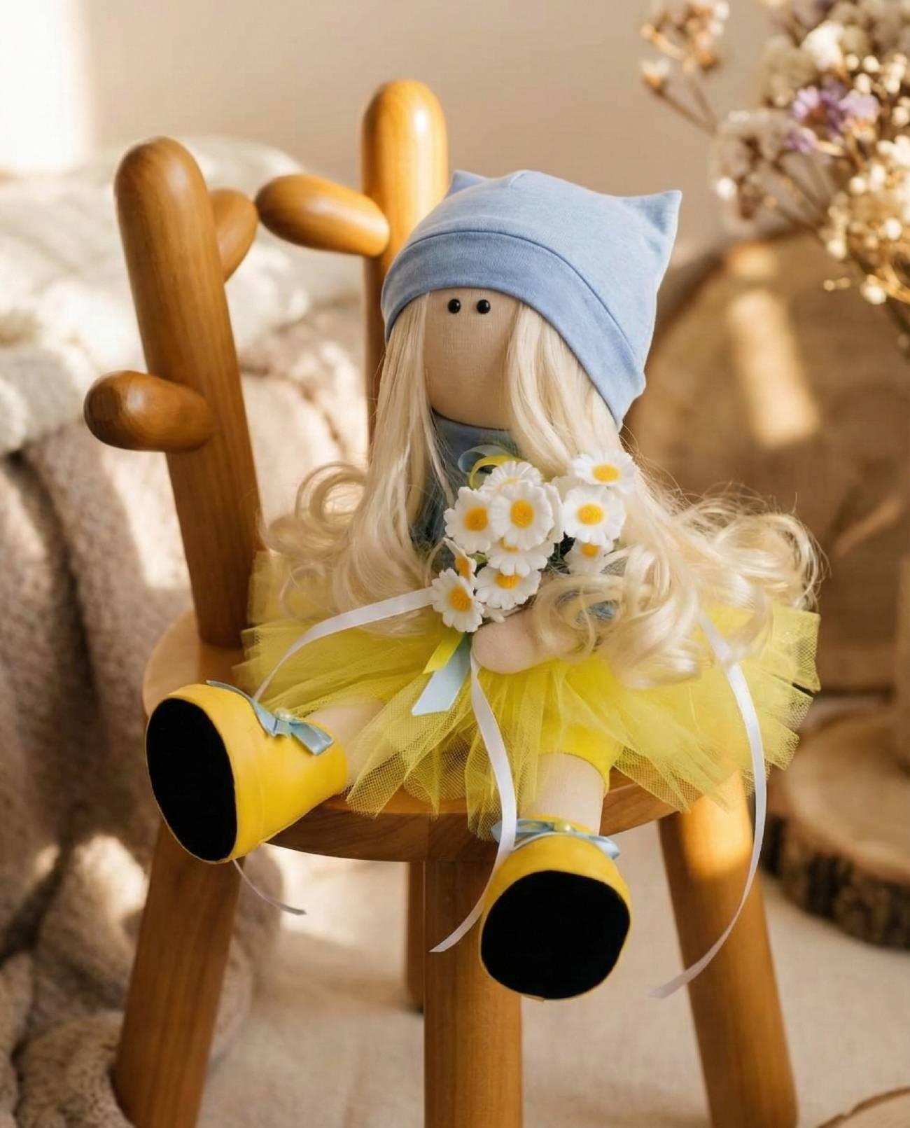 Особливості: інтер’єрна лялька ручної роботи – велика авторська інтер’єрна лялька 37 см у яскравому національному образі маленької українки з квітами польові ромашки у руках. Тільда лялька одягнута в блакитний гольф та пишну жовту спідницю, що відображає українську кольорову гаму та надає їй яскравості і життєрадісності. В руках лялька тримає польові ромашки – символ чистоти, краси та любові до рідної землі. Ця композиція переносить вас в атмосферу української природи, де квіти, як і наші традиції, завжди розцвітають у серцях. Лялька виконана у стилі Тільда, що додає їй особливого шарму. Всі її одяг і туфельки не знімаються, що робить ляльку ще більш стійкою та зручною для декору. Вишукано доповнена текстильною шапочкою, вона додає завершеності образу маленької українки, що ніби оживає на ваших очах. Одна з головних особливостей цієї ляльки – її здатність стояти самостійно без додаткової опори. Це робить її не лише естетично привабливою, але й дуже практичною для розміщення на будь-якій поверхні: на полиці, столику чи комоді. Ця чудова інтер’єрна лялька стане неперевершеною прикрасою вашого дому, додавши йому тепла та автентичності. Створена з любов’ю та увагою до деталей, лялька у національному образі маленької українки є справжнім витвором мистецтва. Вона виконана вручну, кожен елемент її вигляду розповідає про українську традицію та культуру. Лялька текстильна україночка з квітами польові ромашки – це ваш приємний, особливий подарунок з України!