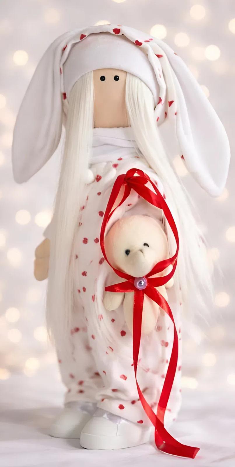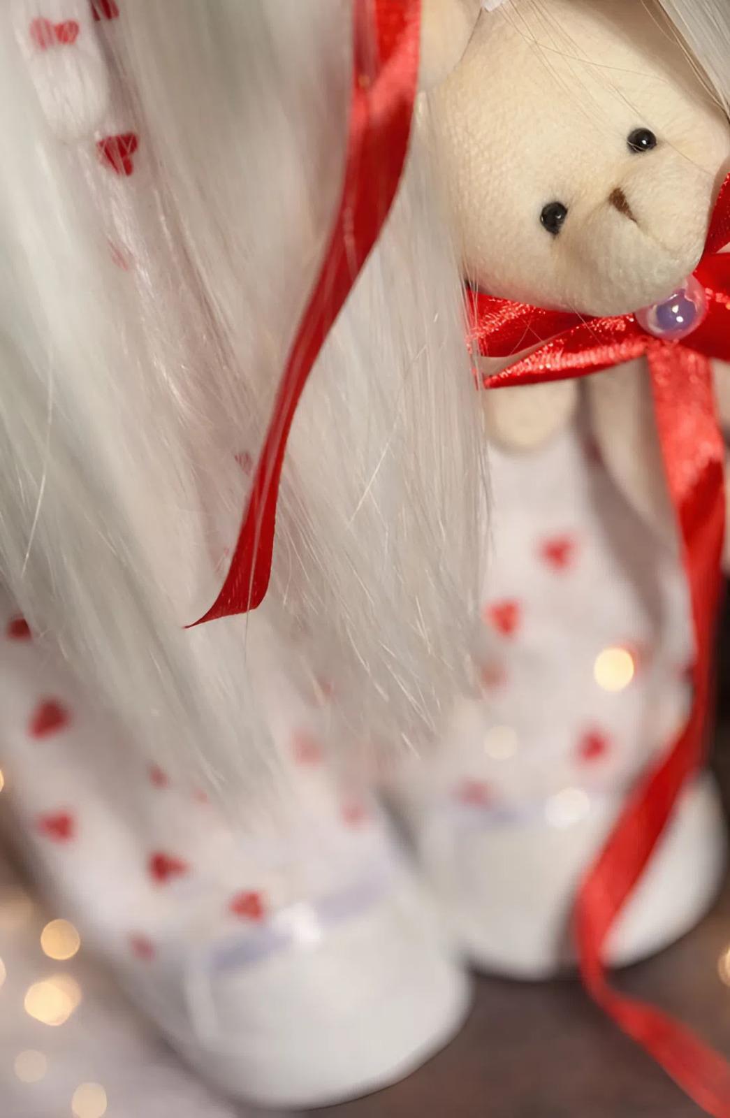 Особливості: інтер’єрна дитяча лялька валентинка – авторська інтер’єрна лялька 37 см у плюшевому комбінезоні. Лялька заввишки 37 см, виконана в романтичному образі плюшевої валентинки: м’який комбінезон у червоні сердечка, милі вушка зайчика та ніжний ведмедик у руках створюють казкову атмосферу турботи й спокою. Світле довге пряме волосся та ніжний образ блондинки роблять ляльку особливо елегантною та фотогенічною. Наша авторська інтер’єрна лялька зайчик сплюшка валентинка – ваш ідеальний аксесуар для дитячої кімнати або подарунок на День всіх закоханих, який подарує ніжність та тепло! Висота ляльки тільда блондинка з довгим прямим волоссям 37 см, вона виконана в романтичному образі плюшевої валентинки, що робить її ще більш оригінальною та особливою. Важливий акцент у ігрової ляльки валентинки – текстильний одяг не знімається, що додає ще більше унікальності та практичності виробу. Ця лялька блондинка зайка чудово стоїть і сидить самостійно, без опори, що робить її ідеальною для декору або для гри. Інтер’єрна лялька валентинка – це не просто іграшка, а символ любові, ніжності та домашнього тепла, який стане особливим подарунком і довго тішитиме маленьке серце. Наша лялька блондинка валенка створена з любов’ю, щоб дарувати тепло, затишок і щирі емоції.