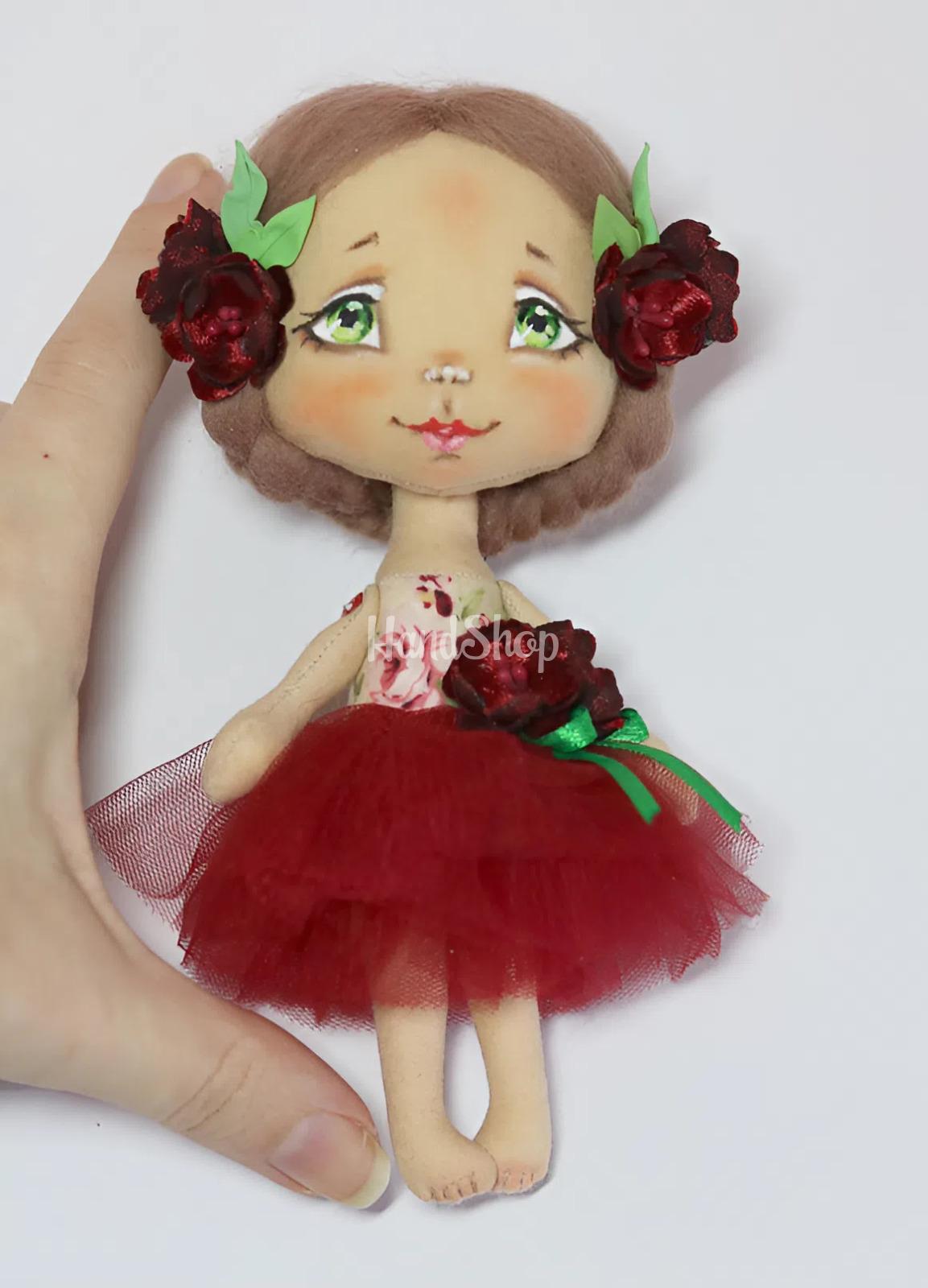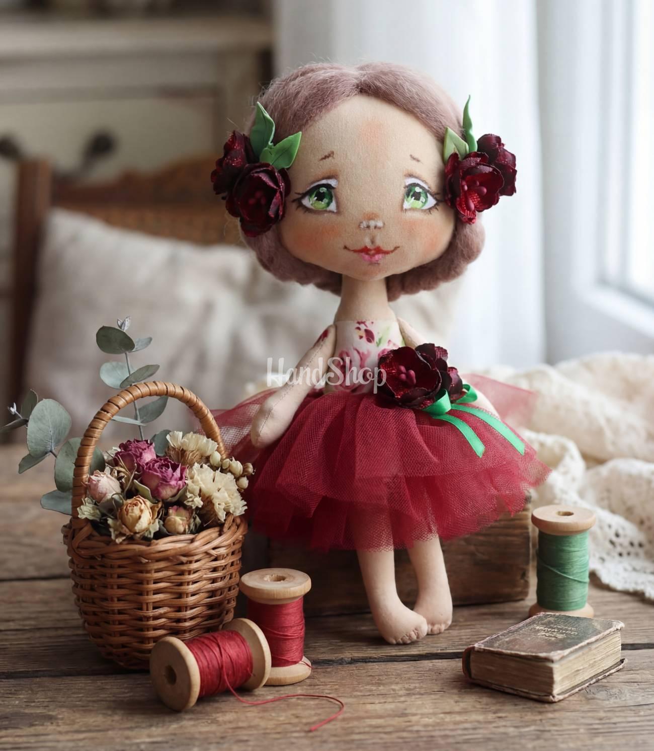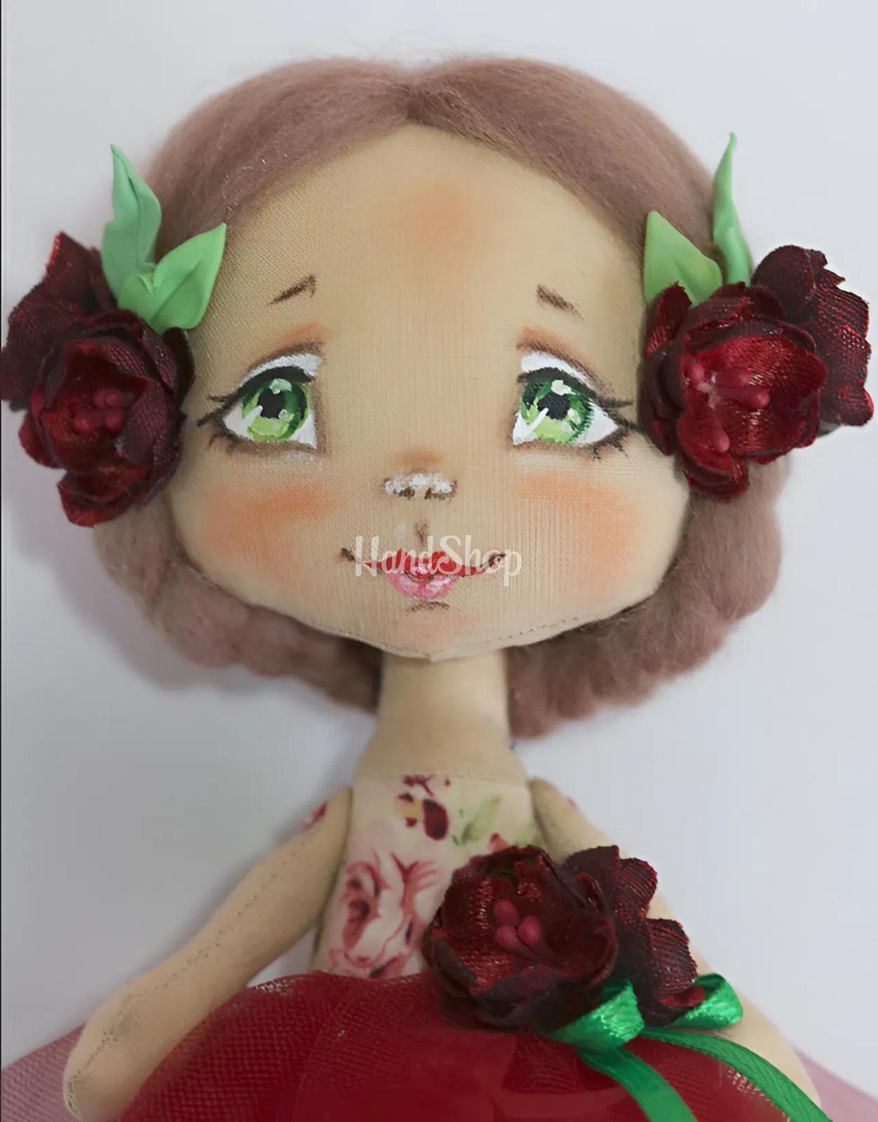 | Матеріал | Акрилові фарби, Атласна стрічка, Намистини, Наповнювач холлофайбер, Натуральна бавовна, Нитки швейні, Тканина трикотаж, Штучні квіти, Штучне волосся |