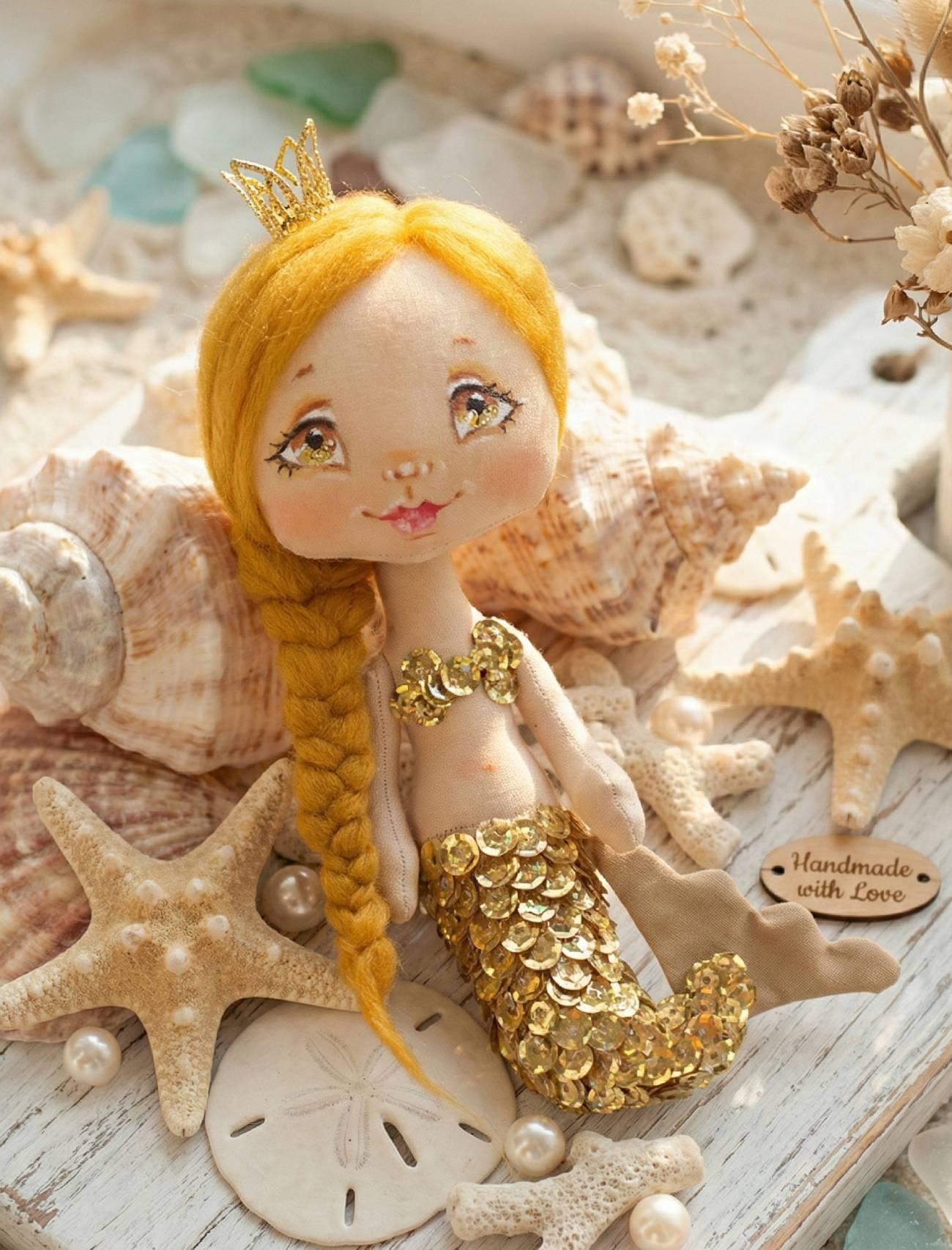Особливості: новорічні дитячі ляльки ручної роботи – міні лялька своїми руками русалонька зі зростом 15 см. Познайомтесь з чудовою новорічною лялькою русалочкою – справжньою казковою принцесою, створеною вручну з великою увагою до деталей. Висота цієї ляльки всього 15 см, але її магія та краса не мають меж! Лялька маленька русалонька з золотавим довгим волоссям, заплетеним у велику довгу косичку, прикрашену золотою короною. Ігрова дитяча лялька виконана в образі казкової ляльки русалки королеви з короною, а її хвіст виконаний з блискучих зототих паєток, що переливаються на світлі. Міні лялечка з красивим волоссям та великою короною, що гармонійно доповнює її образ. Лялечка своїми руками русалонька стоїть лише з опорою! Дитячі ляльки для дівчаток сувеніри русалки – в індивідуальному екземплярі! Ця лялька русалочка стане чудовим сюрпризом для вашої дівчинки на будь-яке свято, будь то Новий рік, День народження або просто як маленька казка для створення святкового настрою! Новорічна міні лялька русалочка – це не просто іграшка, а маленька частинка казки, що живе в руках вашої дитини. Познайомтеся з цією чарівною лялькою та подаруйте дитині частинку магії та краси!