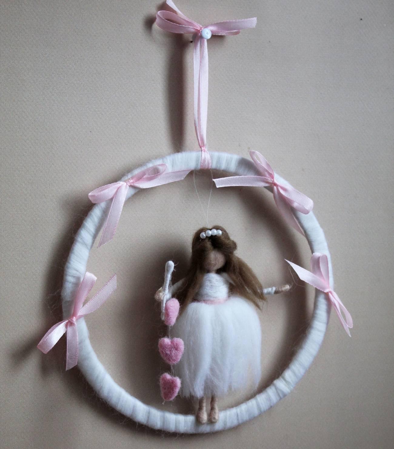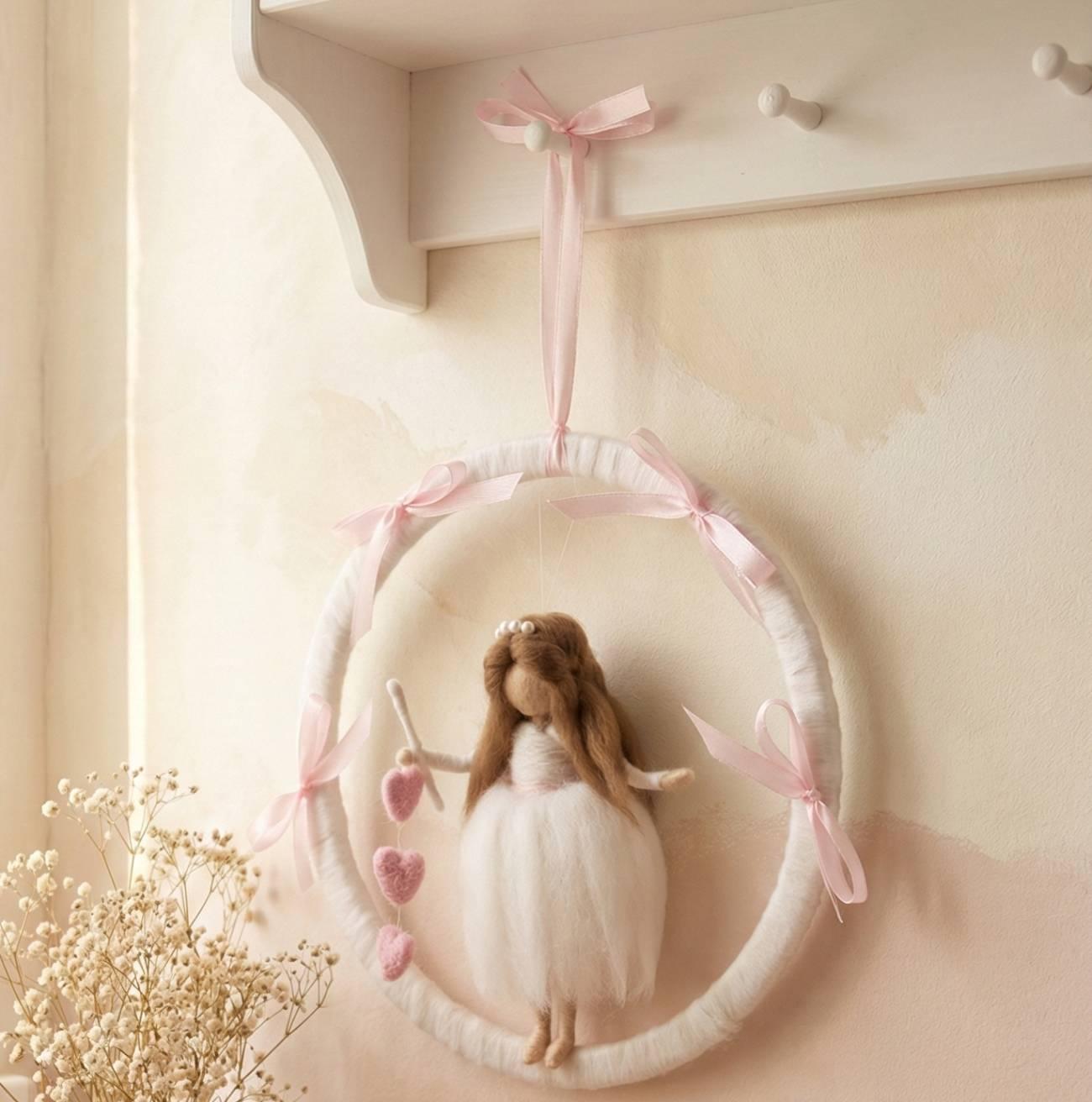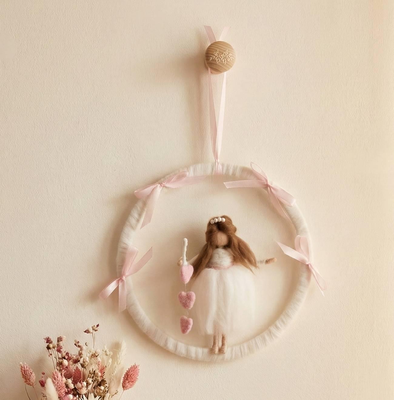 Особливості: ляльки валяння вовни – міні лялька валентинка до 12 см з сердечками на круглій дерев’яній основі діаметром 18 см. Цей романтичний сувенір оберіг з вовни несе в собі атмосферу спокою, любові та домашнього затишку. У центрі композиції – дівчинка з довгим каштановим волоссям валентинка в білому вбранні та рожевим поясом, яка тримає рожеві сердечка як символи щирої любові, турботи й тепла. Її образ легкий і світлий, немов оберіг, який тихо охороняє дім і наповнює його добрими емоціями. М’яка текстура вовни поєднується з натуральним деревом, створюючи гармонійний, живий образ, а стрічки додають виробу ніжності й святковості. Цей авторський декор прикрашений атласними рожевими бантиками ручної роботи – стане затишним акцентом у дитячій кімнаті, спальні або в куточку, де хочеться спокою та тепла. Він також ідеально підійде як особливий подарунок для близької людини – знак уваги, любові й турботи, який залишиться на довгі роки. Кожен виріб виконаний вручну, тому є унікальним і зберігає в собі тепло рук майстра. Це більше, ніж декор – це маленький оберіг із великим серцем.