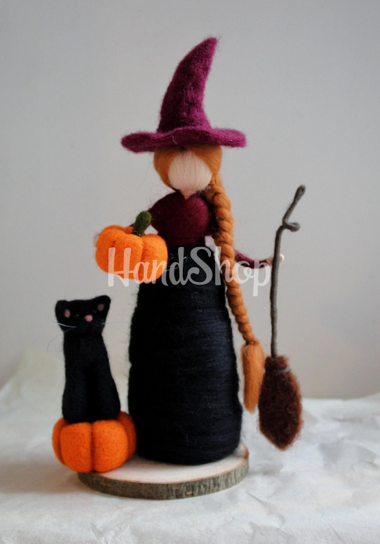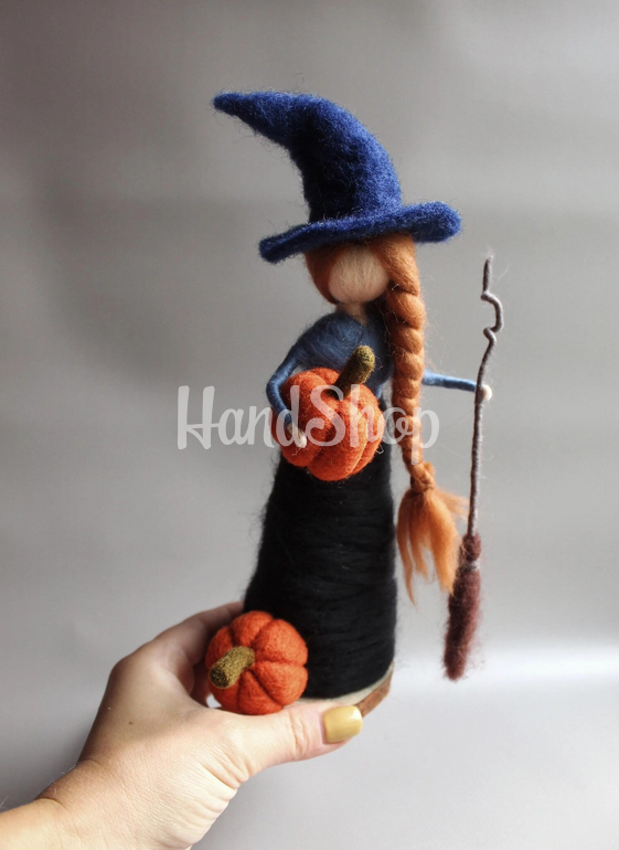 Особливості: ляльки з шерсті ручної роботи – сувенірні ляльки валяння вовни на свято осінні Halloween 2025. Інтер’єрна лялька своїми руками середнього розміру 18-20 см – відьмочка руда лялька на свято Halloween. Додайте магії у свій інтер’єр або зробіть незабутній подарунок з нагоди Хелловіну з нашою унікальною лялькою ручної роботи з вовни мериноса. Це інтер’єрна сувенірна лялька-відьмочка середнього розміру (18–20 см), створена в техніці сухого валяння з натуральної шерсті. Вона стане яскравим акцентом до осіннього декору та чудовим подарунком для поціновувачів незвичайного й милого на містичне свято. Дитяча лялька Хелловін виконана з вовни мериноса в яскравому образі рудоволосої магічної ляльки відьми з довгим волосся. Лялька Хелловін відьма на дерев’яній підставці – закріплені, не знімаються! Лялька валяна з вовни в довгій святковій сукні з чорним капелюхом ковпаком, віником та гарбузиком ручної роботи. Наша авторська сувенірна лялька відьмочка на дерев’яній підставці стане ідеальним – осіннім декором для дому чи дитячої кімнати; сувеніром на Halloween 2025; подарунком для дітей та дорослих, які цінують ручну роботу й казкову атмосферу. Подаруйте частинку тепла та фантазії – оберіть автентичну валяну ляльку-відьмочку, яка наповнить ваш Хелловін затишком і магією!