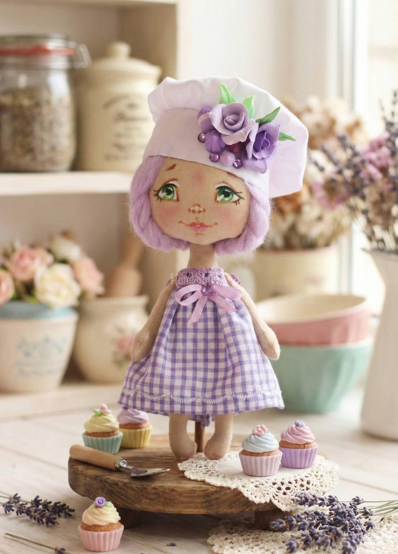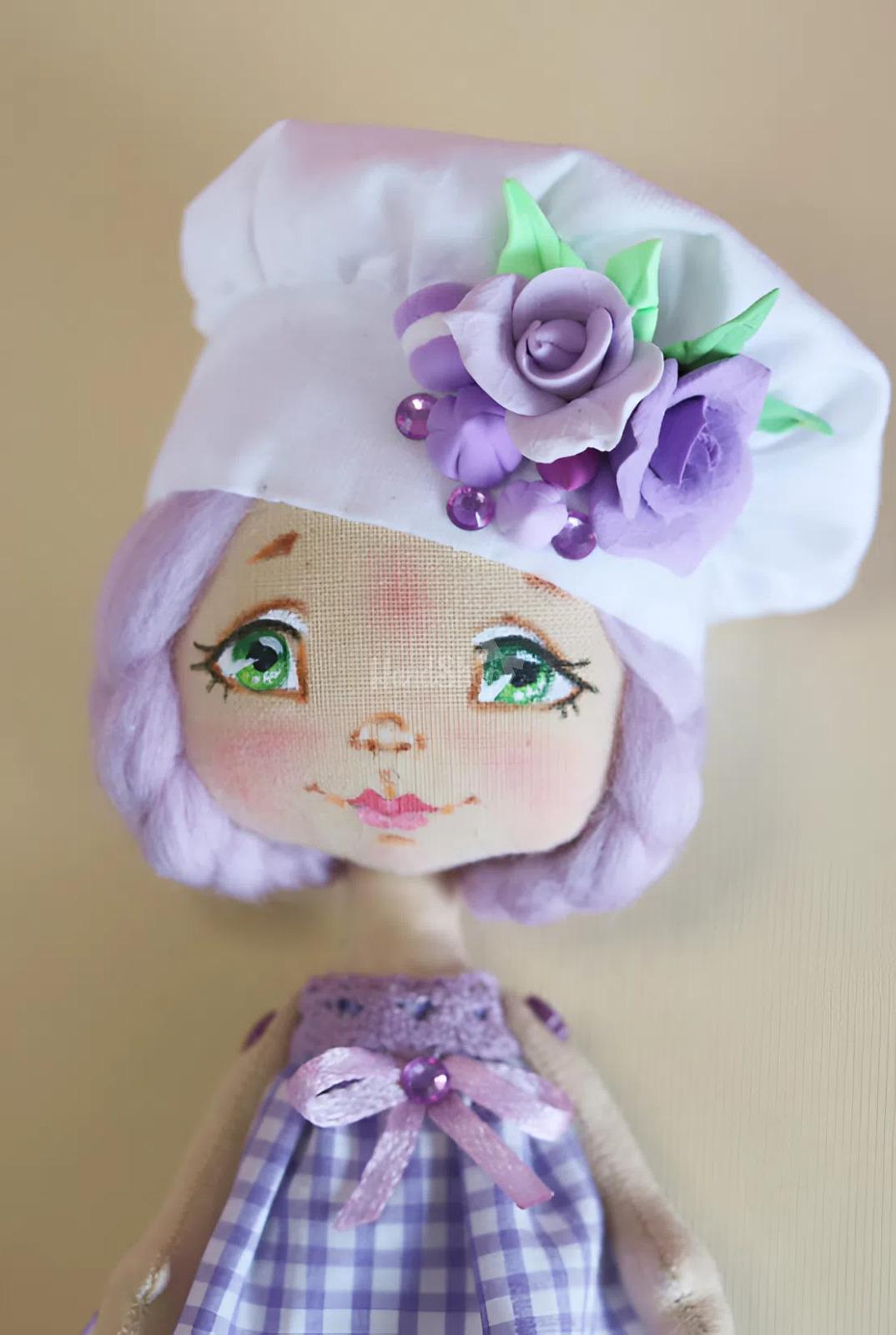 Особливості: дитячі ляльки ручної роботи кондитер – міні лялька своїми руками на зріст 15 см у вигляді маленької кулінарної дівчинки кондитера, яка поєднує казковий образ, ніжні кольори та атмосферу творчості, надихаючи мріяти й створювати солодкі шедеври. Лялька має лілове волосся та великі виразні очі, розписані вручну акриловими фарбами. Її погляд наповнений добротою й фантазією. Образ доповнює білий чепчик, прикрашений фіолетовими трояндами ручної роботи з полімерної глини – кожна квітка виліплена з особливою увагою до деталей. Текстильна лялька-кулінар одягнена у довгу лілову сукню в білу клітинку, декоровану акуратним бантом у тон. Одяг не знімається, що забезпечує цілісність образу та довговічність іграшки. Лялечка стоїть із опорою, тому її зручно розмістити на полиці, столі чи в дитячому куточку. Кожна лялька кухар створюється в індивідуальному екземплярі – це не масове виробництво, а авторська робота з душею. Ця міні-лялька кондитер – не просто іграшка. Вона втілює красу й натхнення однієї з найсолодших жіночих професій, розвиває уяву та прищеплює любов до творчості. Ідеальний подарунок для маленьких мрійниць, які вірять у казку та люблять створювати власний світ.