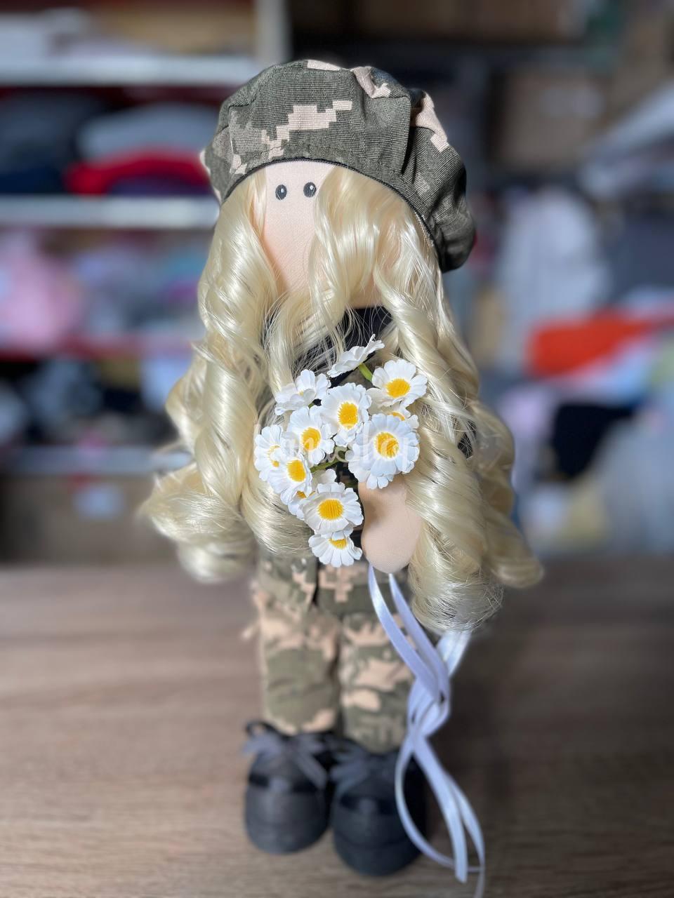 Особливості: авторська текстильна лялька ручної роботи – сувенірна тільда 37 см в патріотичному образі сучасної військової захисниці українки. Іграшка лялька білявка з кудрявим довгим волоссям, у стильній мілітарі формі Збройних Сил України, символізує силу, ніжність і незламний дух наших жінок-захисниць. Авторська текстильна лялька білявка кудрава військова стоїть самостійно, одяг військовій ляльці не знімається! Дівчинка тільда блондинка з довгим волоссям військова захисниця одягнена в українську форму з квітами польовими білими ромашками в руках – виймаються! Лялька дівчина тільда білявка в образі молодої сучасної захисниці України. Лялька військова вбрана у сучасну модель мілітарі форми Збройних Сил України, що надає їй ще більшої автентичності та реалістичності. Ця текстильна лялька військова – не просто сувенір, а символ жіночої відваги, краси та любові до України. Вона стане чудовим подарунком для колекціонерів, патріотів або як оригінальний елемент декору вашого дому. Наша унікальна лялька тільда україночка військова – це зворушливий образ молодої сучасної української захисниці, створений з любов’ю та натхненням.