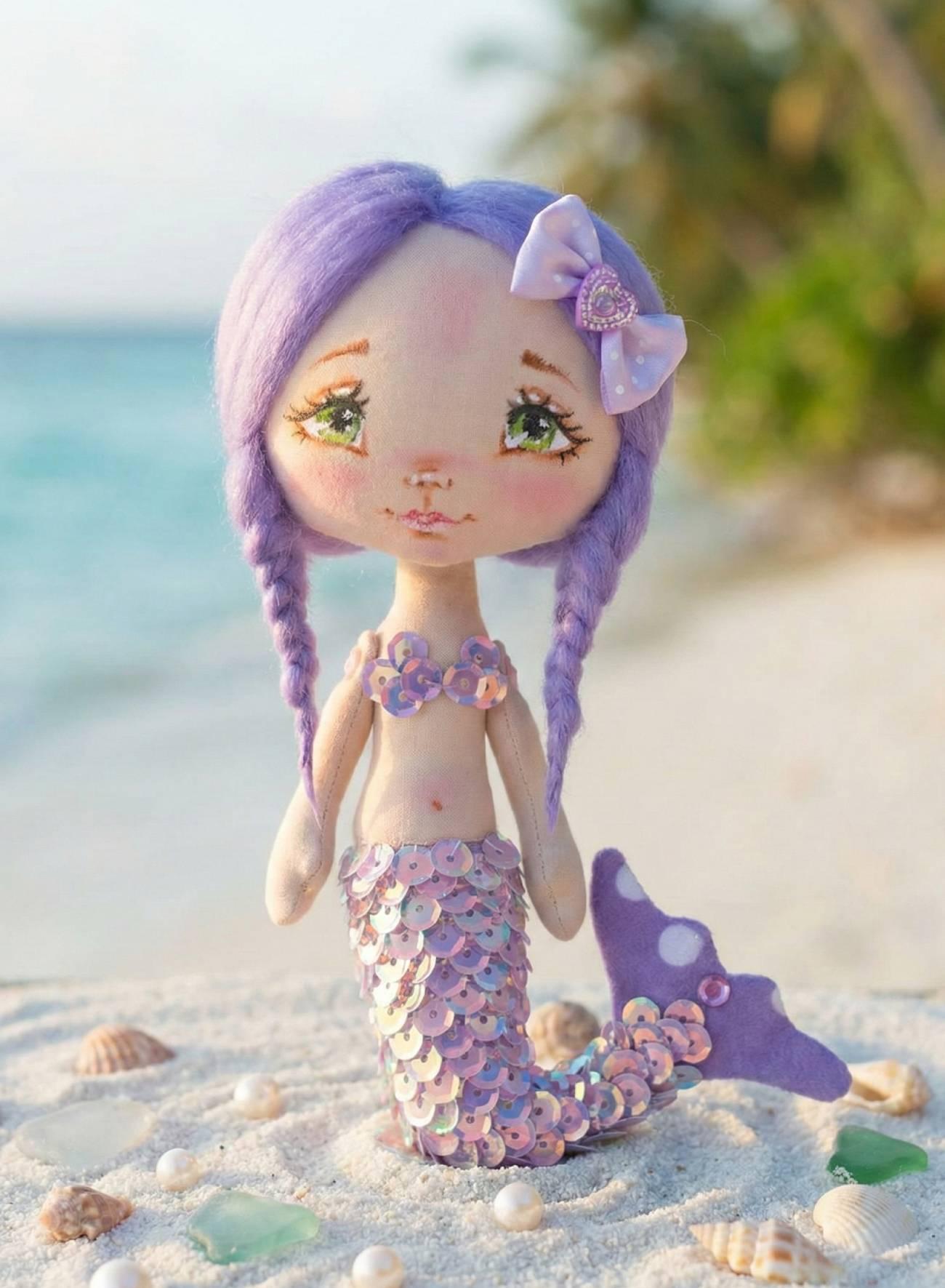 Особливості: дитячі ляльки ручної роботи – міні лялька своїми руками русалка з фіолетовим волоссям зі зростом 15 см. Ця чудова дитяча лялька ручної роботи – справжня маленька русалочка, яка стане улюбленою іграшкою вашої дитини! З розміром всього 15 см, вона ідеально підходить для маленьких рук і може супроводжувати дитину у всіх морських фантазіях. Іграшка русалка з фіолетовим волоссям, заплетеним у косу, вражає своїм ніжним виглядом та чудовим хвостом, що прикрашений блискучими паєтками, які переливаються на світлі. Додатково її зачіска оздоблена квітами троянд ручної роботи, що додають образу елегантності та чарівності. Лялька русалочка стоїть лише з опорою, що підкреслює її витонченість і робить її ще більш привабливою. Кожна така іграшка русалочка є унікальною, адже виготовляється вручну, тому ви отримуєте справжній сувенір, що відрізняється від масових іграшок. Ця лялька русалонька не тільки стане чудовим доповненням до колекції ляльок, але й принесе дитині багато радості під час ігор, розвиваючи фантазію та креативність. Подаруйте маленькій принцесі справжню морську казку з цією унікальною ручною лялькою-русалкою!