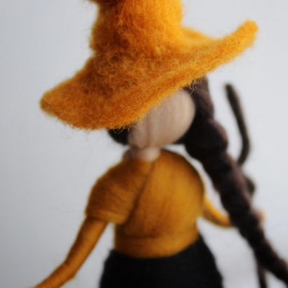 Особливості: ляльки з шерсті ручної роботи – сувенірні ляльки валяння вовни на дерев’яних підставках – дитячі ляльки сувеніри на свято осінні Halloween 2025. Інтер’єрна лялька своїми руками середнього розміру 18-20 см, що робить її ідеальною для декору чи колекціонування чи презентом на свято Halloween 2025. Дитяча лялька Хелловін виконана з вовни мериноса в осінньому образі чорнявої магічної ляльки відьми з довгим волосся, заплетеним у косу. Лялька Хелловін відьма на дерев’яній підставці в довгій помаранчево-чорній сукні та капелюхом ковпаком з мітлою в руках та маленькими тиквами поруч – закріплені, не знімаються! Ця чарівна інтер’єрна лялька відьмочка ручної роботи створена для тих, хто любить магію осені та атмосферу Хелловіна. Виконана з натуральної вовни мериноса у техніці валяння, вона вражає деталізацією та якістю. Ця авторська сувенірна лялька чорнява відьма на дерев’яній підставці стане чудовим подарунком для дітей і дорослих, додасть загадкової атмосфери вашому дому або стане особливим елементом святкового декору. Обмежена серія до Halloween 2025! Замовляйте зараз і створіть справжню казку у своєму інтер’єрі!
