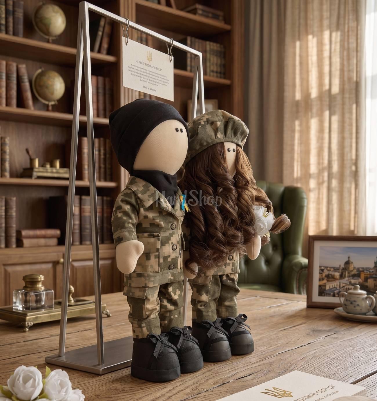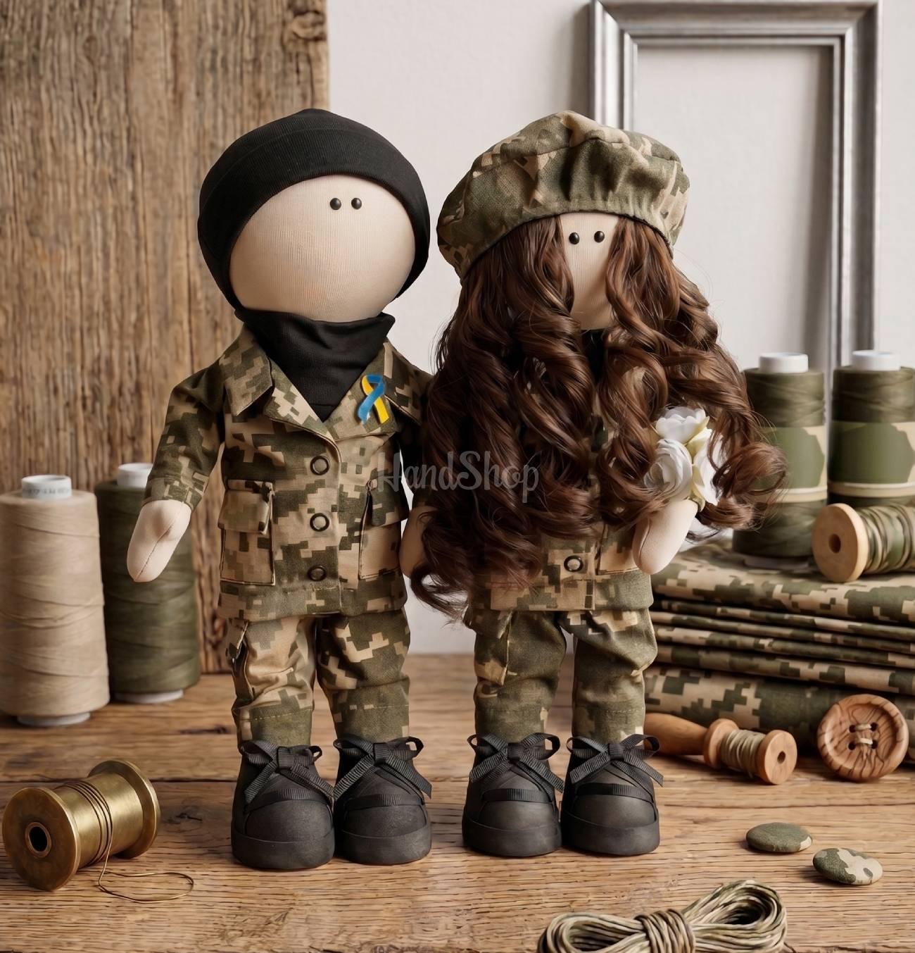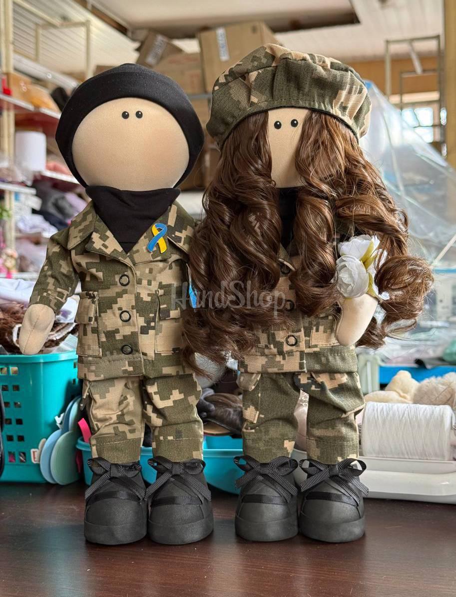 Особливості: авторські сувенірні текстильні ляльки ручної роботи по 37 см в образах сучасних наречених військових українців. Авторські текстильні ляльки військові ручної роботи – це не просто декор, а символ любові, відданості та сили сучасної України. Пара унікальних ляльок висотою 37 см виконана в образах молодих українських наречених-захисників. Вони самостійно стоять, створюючи завершену композицію, яка привертає увагу та наповнює простір особливим змістом. Одяг в військових ляльках не знімається! Дівчина лялька – ніжна тільда з довгим кудрявим каштановим волоссям, що уособлює красу, віру та підтримку. Хлопець лялька тільда – відважний військовий у сучасній формі Збройних Сил України, з металевим значком прапора України, який є невід’ємною частиною образу. Ці ляльки тільди військова пара – це історія про кохання під час війни, про силу духу та незламність українців. Авторські тільда ляльки стануть особливим талісманом для ваших рідних і близьких, наповнюючи дім теплом, гордістю та українським духом. Авторські тільда ляльки українці військові – чудовий та оригінальний подарунок молодятам. Авторські текстильні ляльки ручної роботи українці будуть талісманом сувеніром вашим рідним та близьким з України!