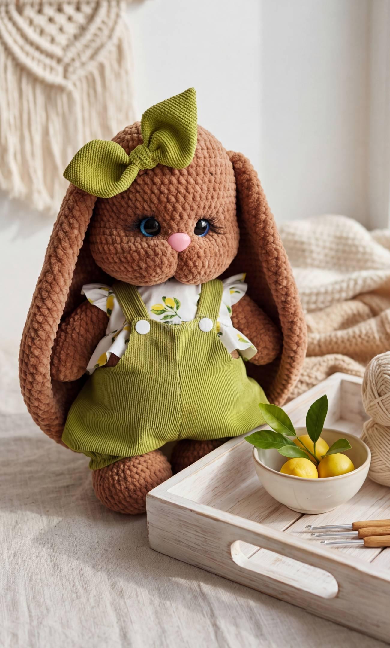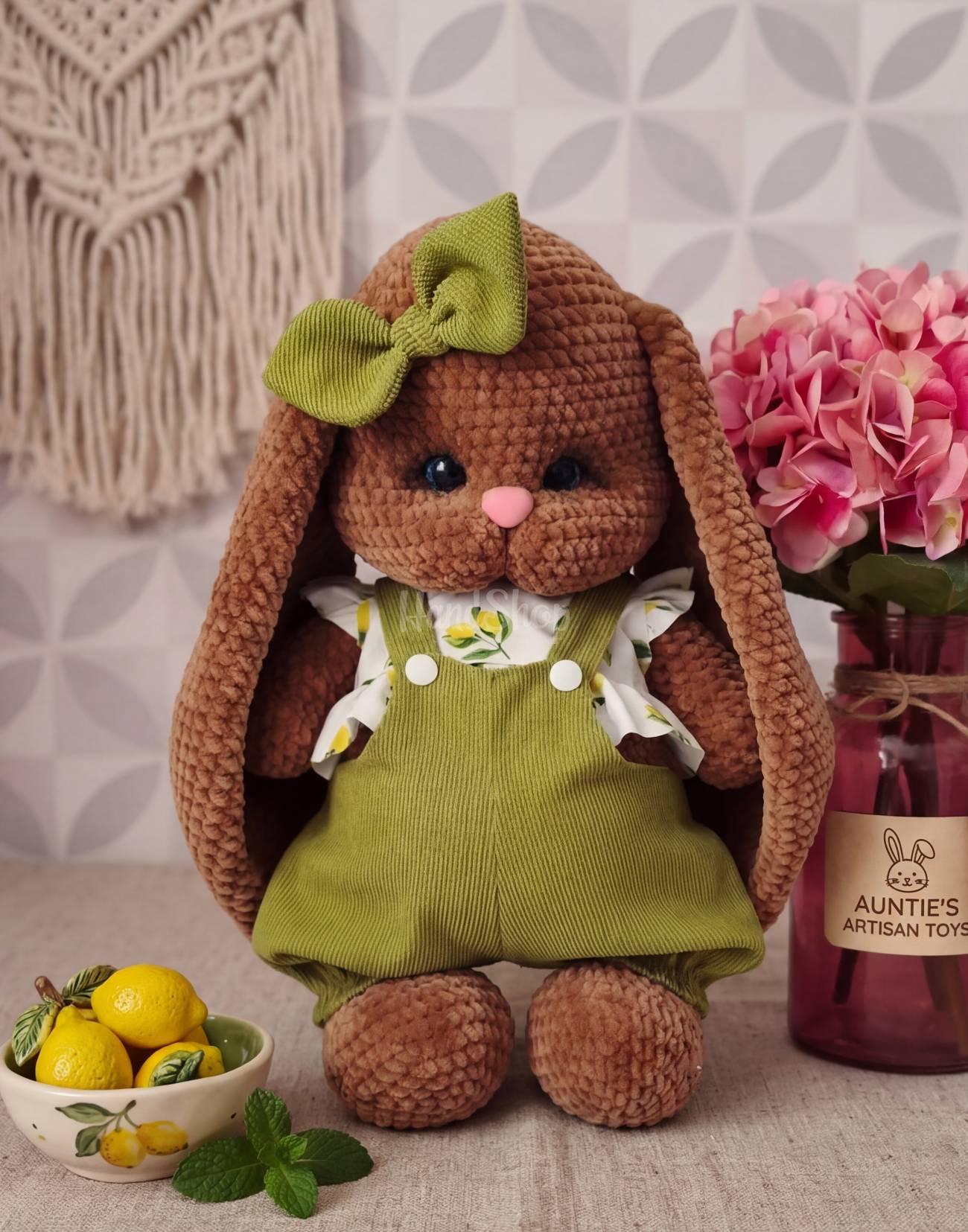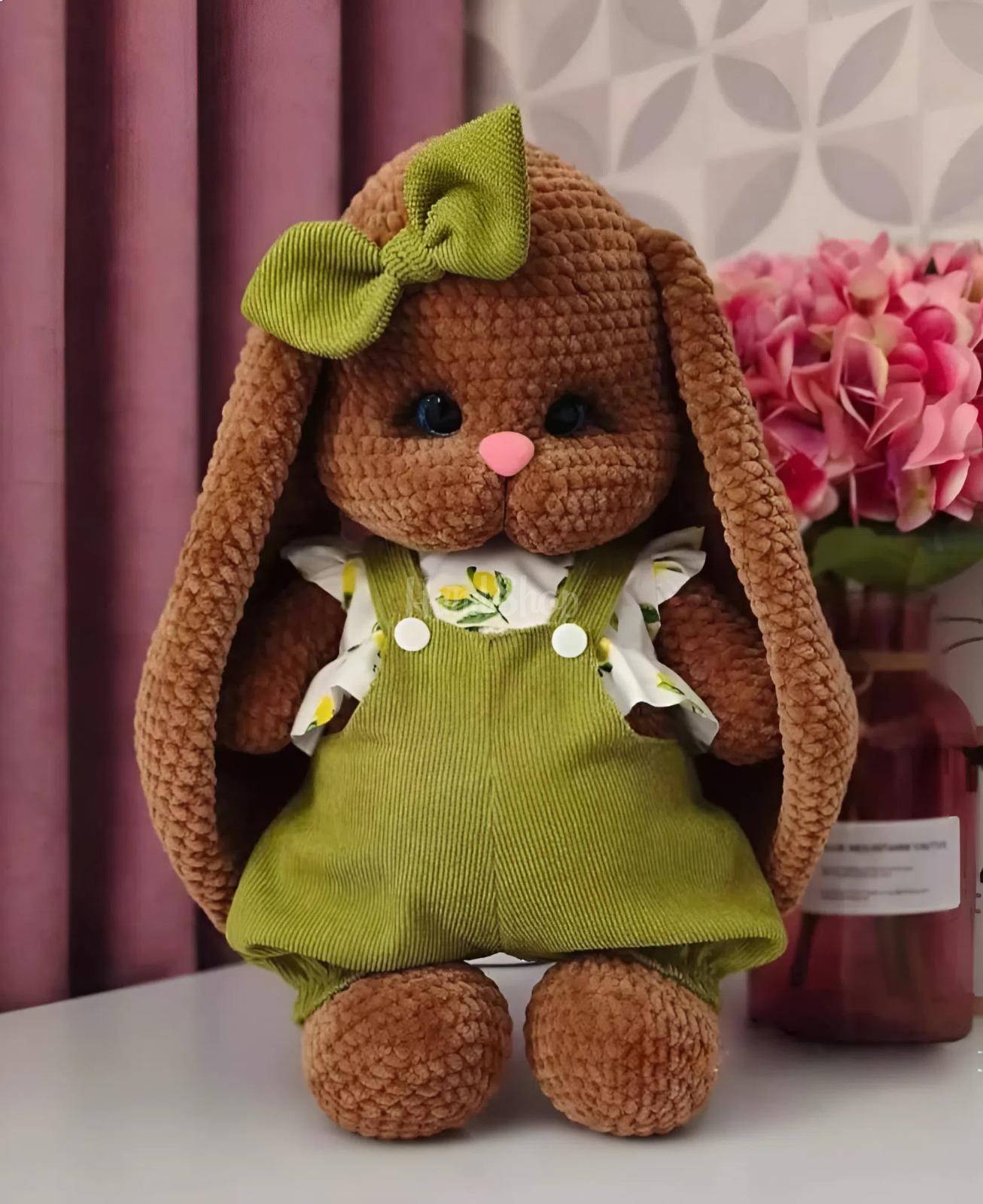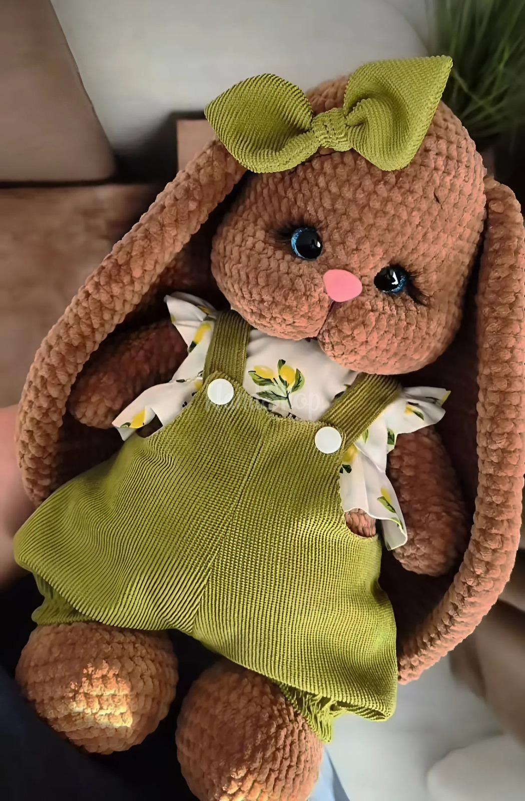 Особливості: іграшки зайчики ручної роботи – авторська м’яка іграшка своїми руками дівчинка зая у великодньому образі Ця чарівна дівчинка-зайчик створена з ніжної гіпоалергенної плюшевої пряжі у стильному коричнево-фісташковому поєднанні. Вона має довгі вушка, рухомі ручки та ніжки, що робить гру ще цікавішою та живішою. Особливість іграшки – її універсальність: зайка може сидіти, але її основне положення – стоячи з опорою. Завдяки цьому вона виглядає особливо ефектно в інтер’єрі та стане чудовим подарунком на Великдень 2026. Зайчик одягнений у стильний фісташковий комбінезон і ніжну блузку з лимонним принтом. Увесь одяг знімається, тому дитина може змінювати образ улюбленої іграшки. Завершує образ акуратний бантик у тон, який додає ще більше ніжності. Кожна деталь виконана з любов’ю: приємна на дотик текстура ідеально підходить для обіймів, а продуманий дизайн дарує відчуття затишку та тепла. Мила зайка ручної роботи – це не просто іграшка, а справжній великодній настрій у кожній деталі. Ця зайка обов’язково стане улюбленицею та подарує безліч радісних моментів.