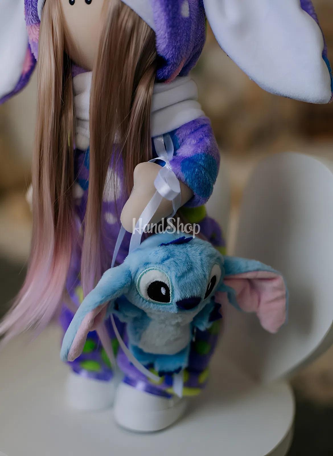 Особливості: інтер’єрна дитяча лялька велика – авторська тільда лялька 37 см у різнокольоровому фіолетовому плюшевому комбінезоні з вушками зайки та трендовою іграшкою у руках Стіч. Наша авторська інтер’єрна лялька зайчик сплюшка – ідеальний аксесуар для дитячої кімнати або подарунок, який подарує ніжність та тепло! Ця лялька висотою 37 см виконана в стильному фіолетовому плюшевому комбінезоні з милими зайчачими вушками, які додають їй особливого шарму. Комбінезон у ляльки тільда має яскравий принт з різнокольоровими таполапками, що робить ляльку ще більш яскравою та оригінальною. Привітний вигляд та м’якість матеріалів надають їй особливого тепла, що ідеально пасує для дитячої кімнати. Завдяки довгим прямим волоссям з ніжним рожевим омбре, ця лялька виглядає надзвичайно мило та елегантно. Такий аксесуар додасть дитячій кімнаті не лише тепла та затишку, але й стильного вигляду. Вона буде чудово виглядати на поличці, ліжку чи улюбленому кріселку вашої малечі. В руках цієї милої ляльки – не просто іграшка, а справжній тренд! Стіч, цей популярний персонаж, який вже завоював серця багатьох дітей по всьому світу, буде чудовим компаньйоном для вашої малечі. Лялька «Зайчик Сплюшка» з ним виглядає ще більш кумедно та чарівно! Наша інтер’єрна лялька – це не просто іграшка, це справжній символ ніжності і турботи. Вона стане чудовим подарунком для вашої дитини, який даруватиме радість, посмішки та тепло. Лялька «Зайчик Сплюшка» – це не просто декоративний елемент, це маленька улюбленка, яка супроводжуватиме малюка у снах і пригодах.