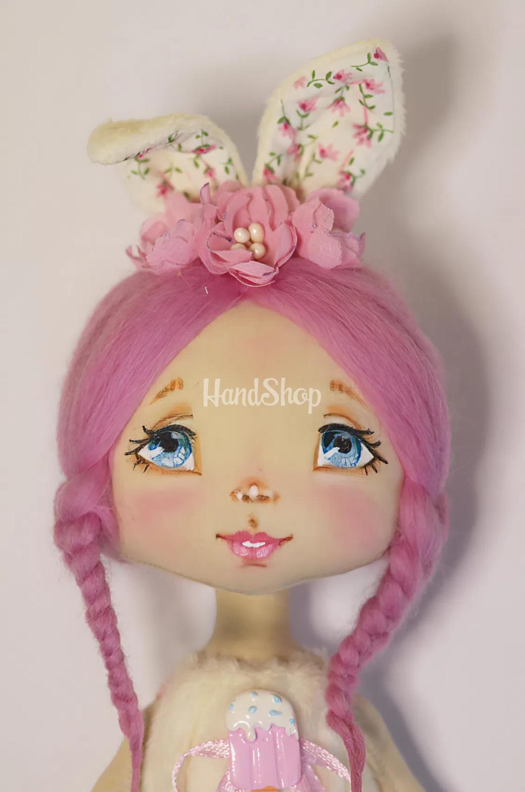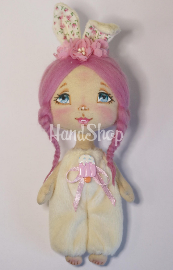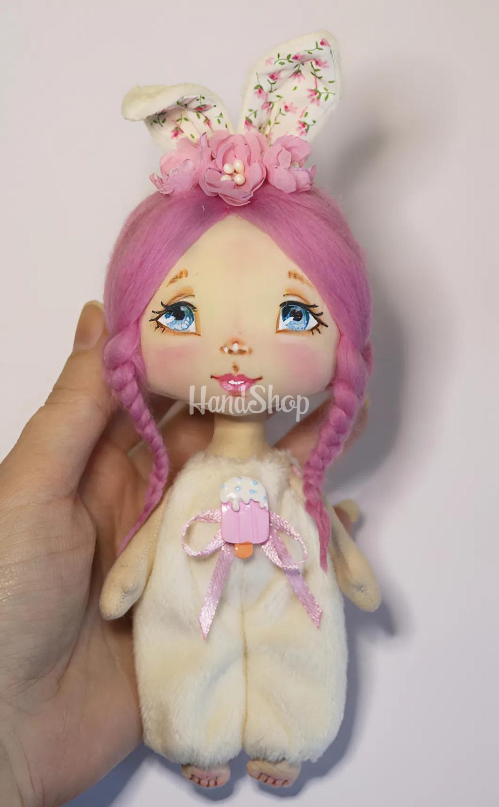 Особливості: дитячі ляльки ручної роботи – міні лялька своїми руками зі зростом до 15 см. Дитяча лялька іграшкова виконана у образі дівчинки зайки з рожевим косичками в плюшевому комбінезоні, прикрашеним морозивом з полімерної глини та вушками з рожевими квіточками ручної роботи. Іграшкова лялька текстильна зая має розписне личко, рожеве волосся з зачіскою – дві косички, прикрашені рожевими квіточками ручної роботи, що надають їй ще більшої привабливості. Унікальність цієї ляльки у комбінезоні – у її дизайні: одяг комбінезон зі плюшу не знімається, що робить її ще більш стійкою та зручною для гри. Міні-лялька з косичками може стояти з опорою, що додає можливість для створення різноманітних поз. Заввишки до 15 см, ця дитяча іграшка в образі чарівної зайки казкової красуні стане чудовим другом для вашої дитини. Лялька виконана з м’якого текстилю, що робить її приємною на дотик і безпечною для малят. Лялька текстильна у комбінезоні – це ідеальний подарунок, який подарує радість та посмішки!