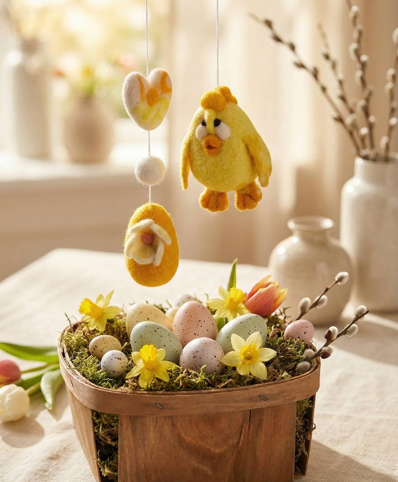 | Розмір | 8 см – жовте курча; 6 см – жовте яєчко з квіткою, 34 см – довжина підвіски з великодніми елементами |