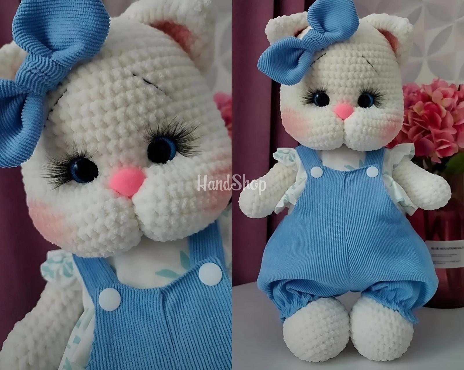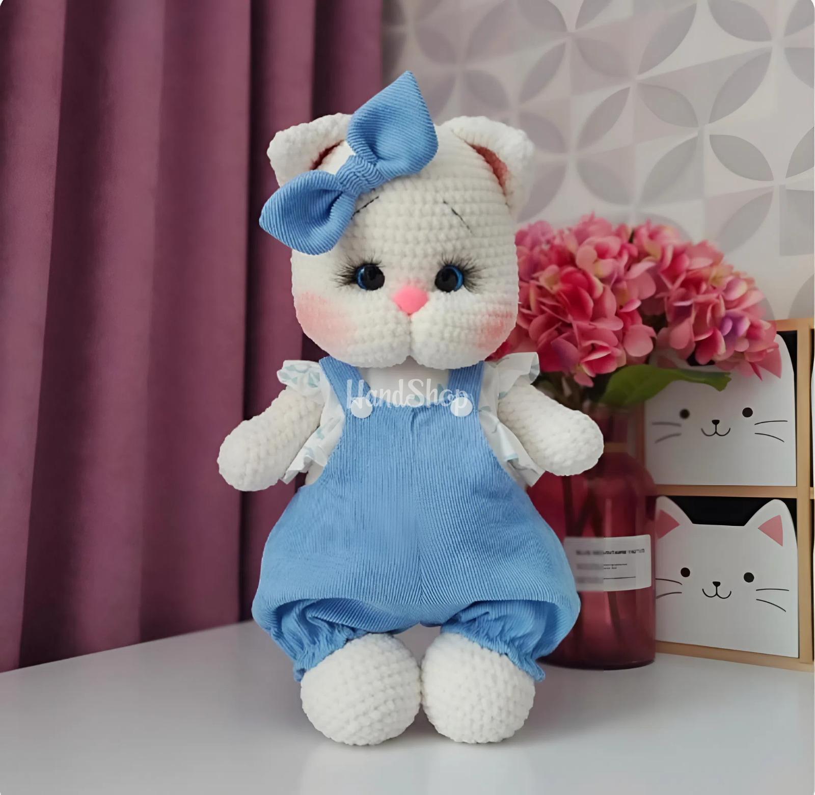 Особливості: дитячі іграшки ручної роботи – милий білий в’язаний котик дівчинка своїми руками. Заввишки 35 см, котик іграшка одягнений в стильний фіолетовий комбінезон з бавовняною блузочною і доповнений милим бантиком на голові – справжня модниця серед іграшок! Іграшка в’язана білий котик може сидіти, але його основне положення – стоячи з опорою, що дає йому особливий вигляд. В’язаний білий котик має рухомі ручки та ніжки, що дозволяє створювати різні пози та грати з ним на різні способи. Виконаний з м’якої, гіпоалергенної плюшевої пряжі в білому кольорі, цей котик не тільки красивий, а й безпечний для дітей. Ця сувенірна велика іграшка кіт, в’язана гачком, стане чудовим подарунком для ваших малят або колекціонерів. Змінний одяг на котику – фіолетовий комбінезон та бантик – дозволяє легко створювати нові образи для іграшки, додаючи ще більше радості в гру!Прекрасний подарунок для маленьких сердець – дитячі іграшки ручної роботи котики, які приносять тепло та ніжність! Цей милий білий котик дівчинка, створений з любов’ю, вражає своєю чарівністю та деталями. Додайте до своєї колекції або зробіть подарунок малечі – цей котик принесе радість і тепло в будь-яку оселю!