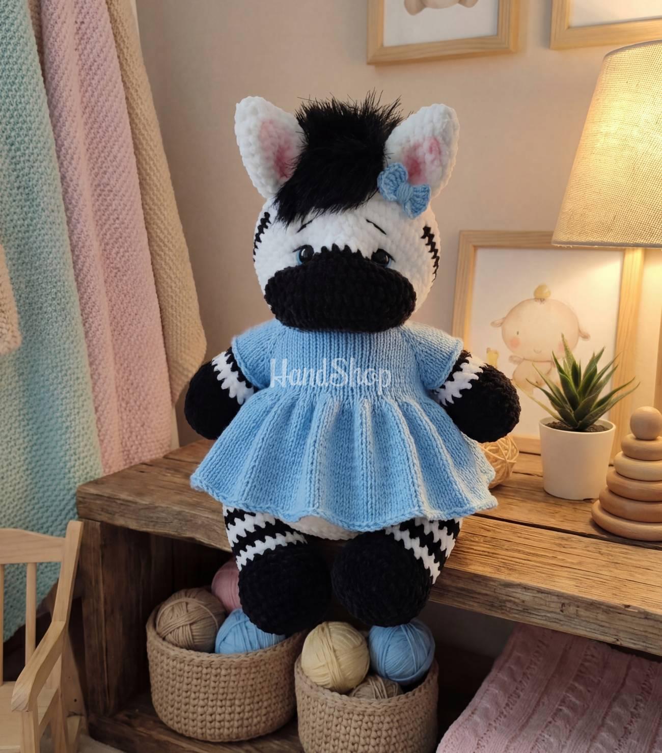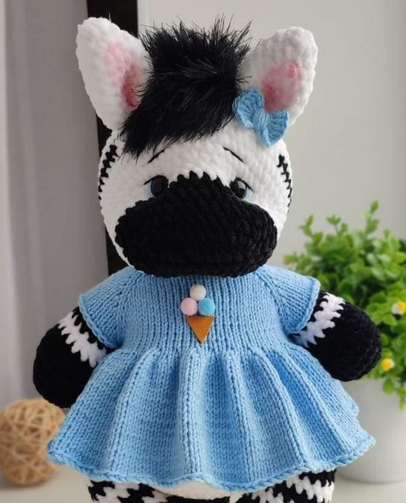 Особливості: м’які іграшки в’язані зебри авторські – красива велика плюшева зебра дівчинка до 35 см стоячи. В’язана іграшка зебра в образі красуні дівчинки може стояти та сидіти тільки з підтримкою. Зебра іграшка з рухомими ручками та ніжками. Іграшка зебра у сукні – трикотажна іграшка гачком зебра в красивій довгій блакитній – знімається! М’яка іграшка зебра ручної роботи сувенір – це настрій та особливий презент на день народження, Великдень! Пропонуємо оригінальний подарунок – велику іграшку м’яку красуню дівчинку у сукні. М’яка іграшка зебра порадує і зачарує не лише дітей, а й дорослих!
