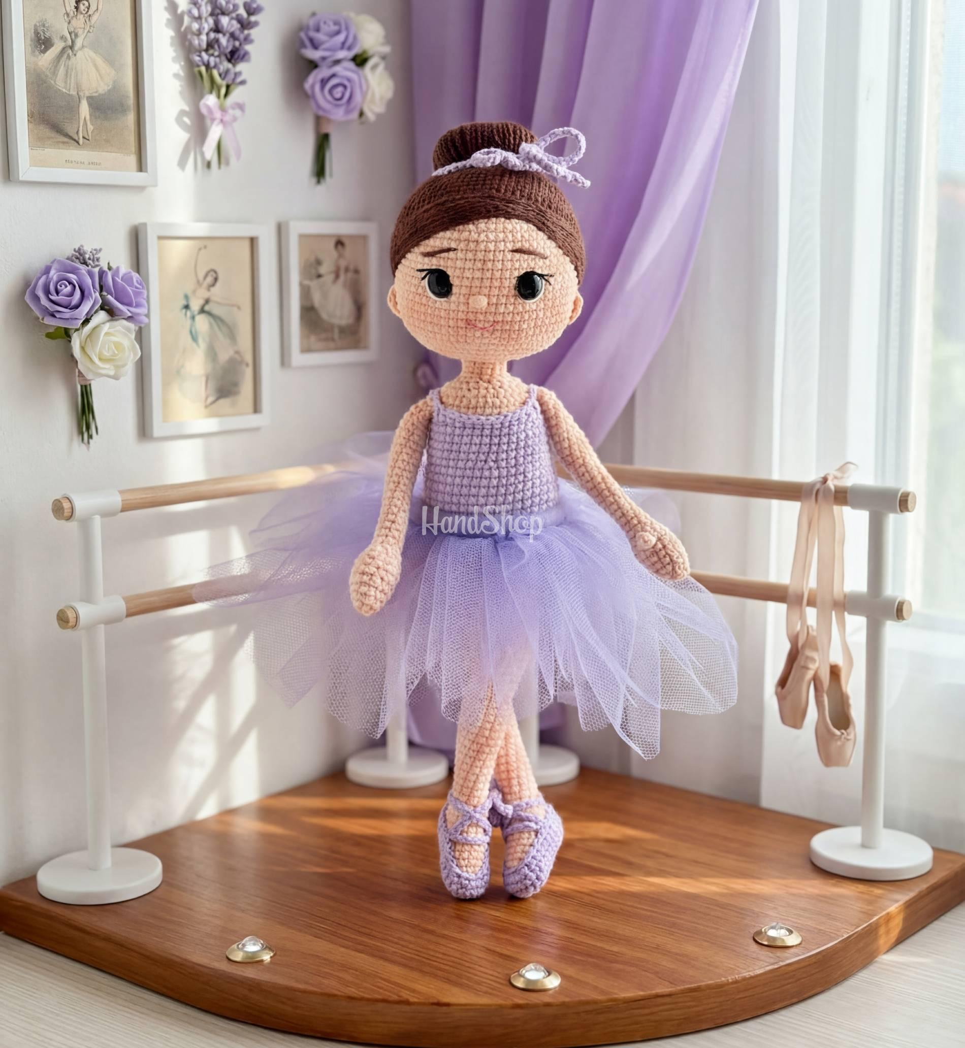 Особливості: велика в’язана лялька крючком – сувенір іграшка лялька 30 см в образі танцівниці балерини в пуантах та в фіолетовій пачці. Наша авторська в’язана лялька крючком – ідеальний сувенір та подарунок для любителів мистецтва і балету! Висотою 30 см, ця чудова балерина виконана з великою увагою до деталей. Вона одягнена в стильну фіолетову пачку, витончену фатинову спідничку та ліловий в’язаний боді, що підкреслюють її елегантний образ. На ногах – пуанти, як у справжньої балерини, а зачіска у вигляді гульки додає ще більше шарму та витонченості. В’язана лялька балеринка – не просто іграшка, а справжній витвір рукоділля, який зачаровує своєю ніжністю та елегантністю. Вона стане чудовим подарунком для дітей, які захоплюються балетом, а також для колекціонерів ляльок. Ідеальний вибір для будь-якої шанувальниці класичного мистецтва танцю! Купіть цю іграшку ляльку балерину в свою колекцію або подаруйте її близьким, і нехай вона приносить радість та натхнення на кожен день!