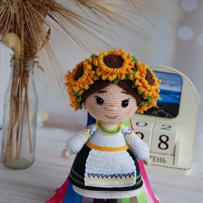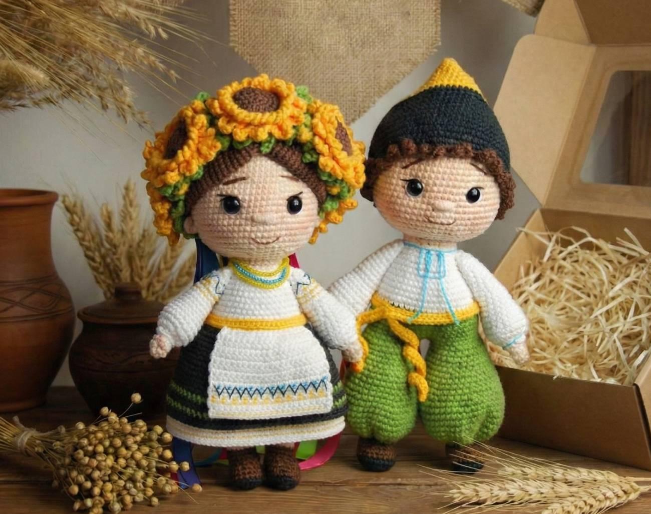 Особливості: ляльки весільні пари валентинки – авторські в’язані ляльки ручної роботи по 23 см в образі української молодої пари нареченого та нареченої. Пара авторських весільних ляльок – не стоять самостійно, одяг у весільних ляльках НЕ знімається! Лялька україночка у довгій сукні вишиванці. Лялька сувенірна українка з віночком із польовими квітами – соняшники та різнобарвні стрічками. В’язана крючком іграшка україночка – в’язана лялька у білій сукні – не знімається. У в’язаній лялечці крючком віночок соняшники – не знімається. Українська іграшка – парубок козак виготовлений з якісних матеріалів – бавовняна пряжа. а всі деталі, включаючи вишиванку та зелені шаровари, зроблені з особливою увагою до деталей та пришиті майстрами вручну. Ляльки у національному українському образі наречених – чудовий та оригінальний подарунок молодятам. Авторські в’язані ляльки ручної роботи у жовто-зеленій кольоровій гамі будуть чудовим сувеніром вашим рідним та близьким з України!