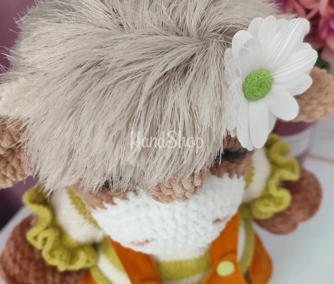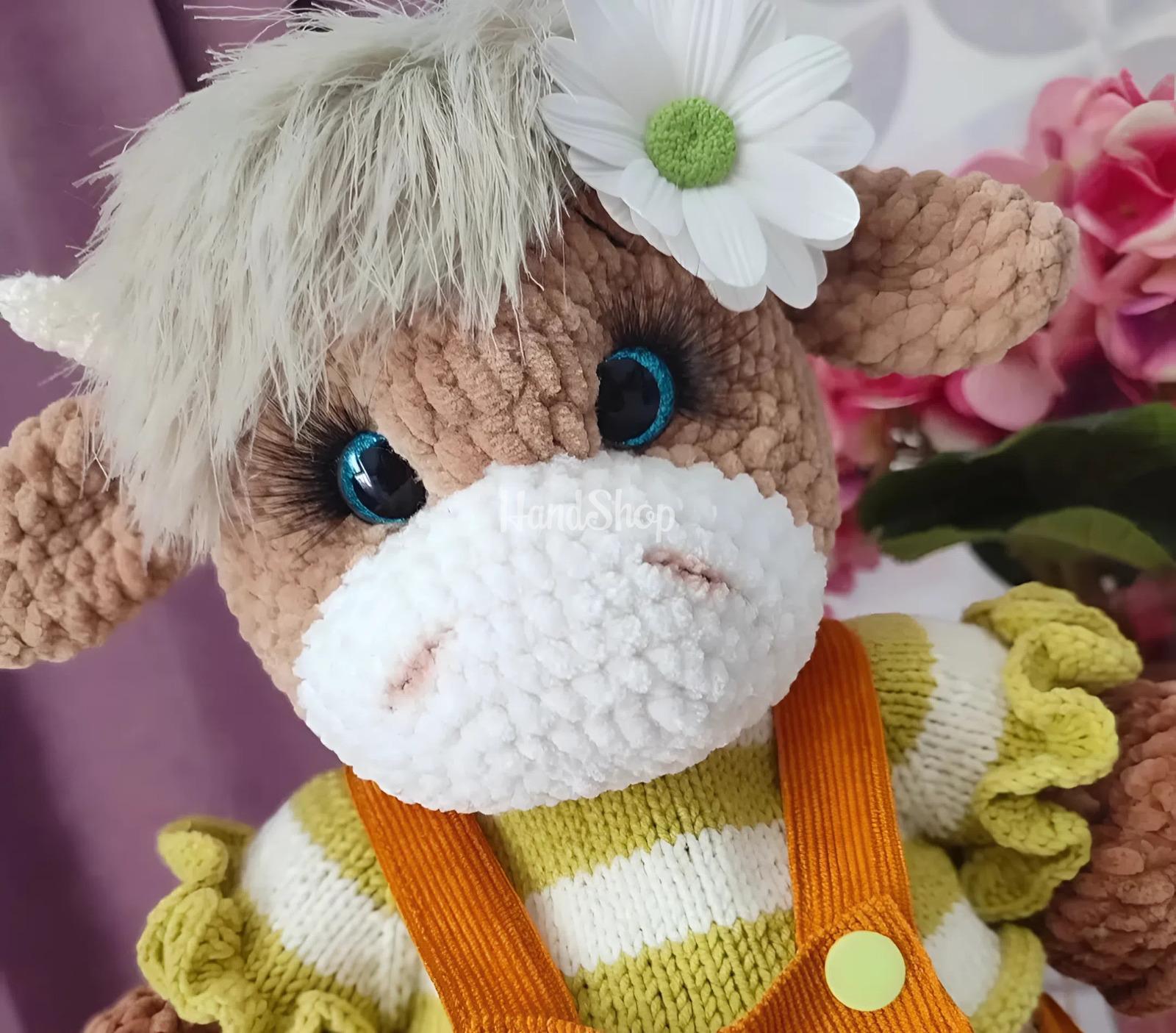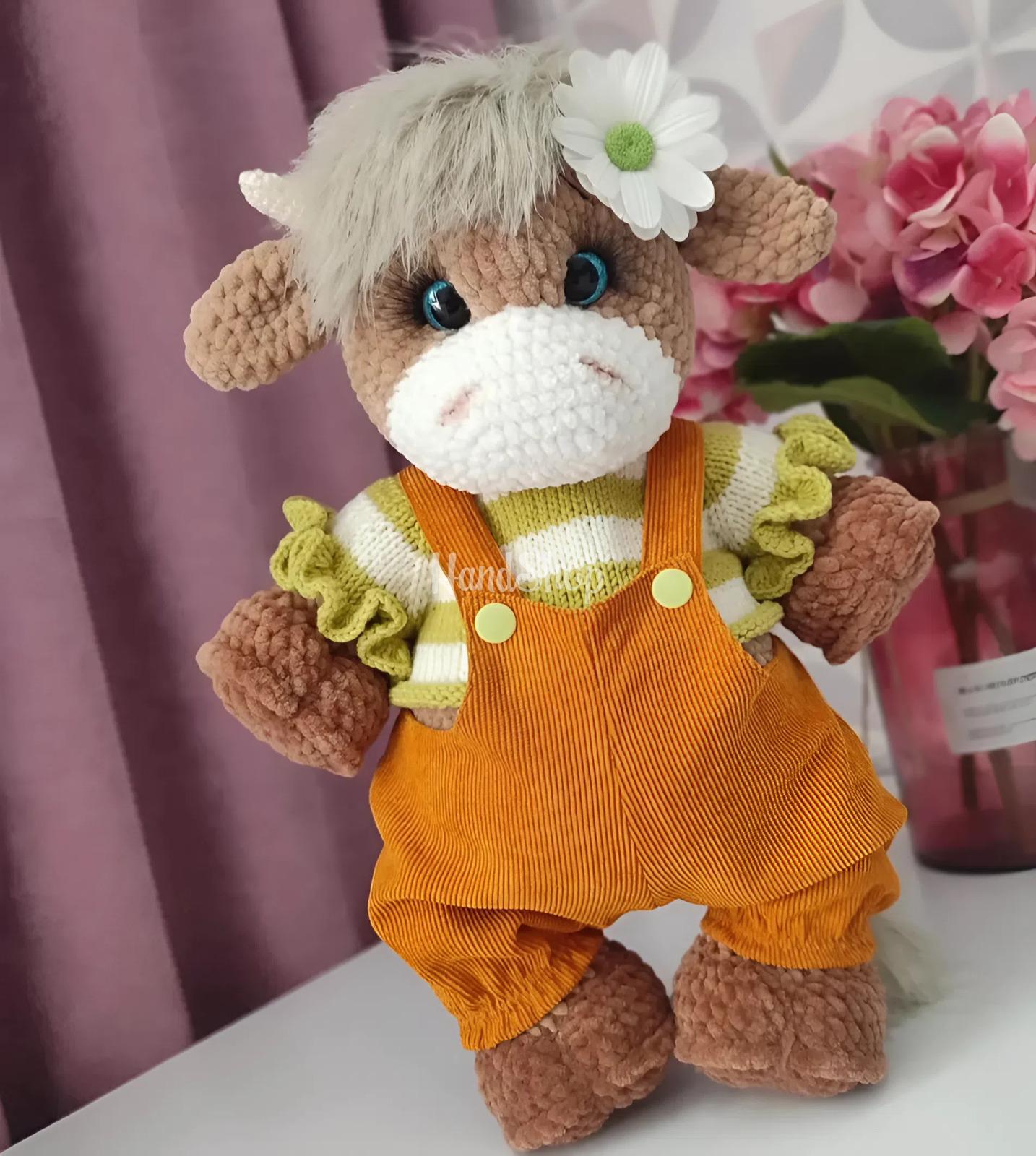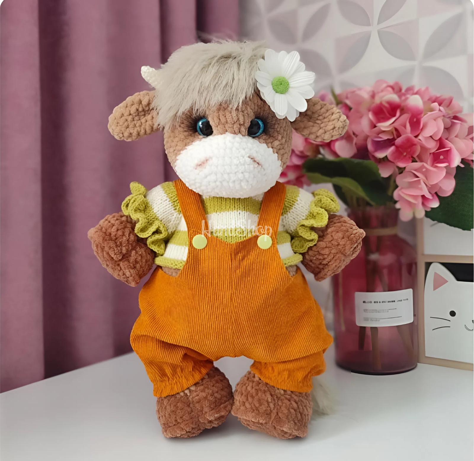 Особливості: дитяча м’яка іграшка ручної роботи корівка в комбінезоні – велика м’яка сувенірна іграшка своїми руками 33-35 см. Ця в’язана велика іграшка ручної роботи корівка дівчинка, висотою 33-35 см, виконана з особливою любов’ю та увагою до деталей. Вона стане справжнім другом для малюка, даруючи йому радість і теплоту. Іграшка корівка одягнена в помаранчевий комбінезон і салатово-білу кофтинку, які знімаються, що додає можливість для творчої гри. Квітка ромашка на її голові додає ще більше чарівності, створюючи образ справжньої маленької модниці. Іграшка в’язана корівка має міцну конструкцію і може самостійно стояти, що робить її не тільки іграшкою для обіймів, але й декоративним елементом, який прикрасить кімнату. Кожна корівка виготовлена вручну, що гарантує неповторність кожної іграшки. Всі матеріали, використані для створення цієї іграшки, є безпечними для дітей, що важливо для батьків. М’які та приємні на дотик тканини забезпечують комфорт під час гри та обіймів, а міцна конструкція дозволяє іграшці служити вам довгі роки. Наша велика м’яка корівка – це не просто іграшка, це маленький друг, якого так люблять діти. Вона стане ідеальним подарунком для свят, дня народження або просто для того, щоб порадувати своїх близьких. Її миле обличчя, м’якість і стильний образ з помаранчевим комбінезоном точно викличуть усмішку у малюка та захоплення у дорослих. Подаруйте радість і теплоту з цією чудовою іграшкою! Корівка в комбінезоні стане справжнім улюбленцем, якому захочеться дарувати обійми знову і знову!