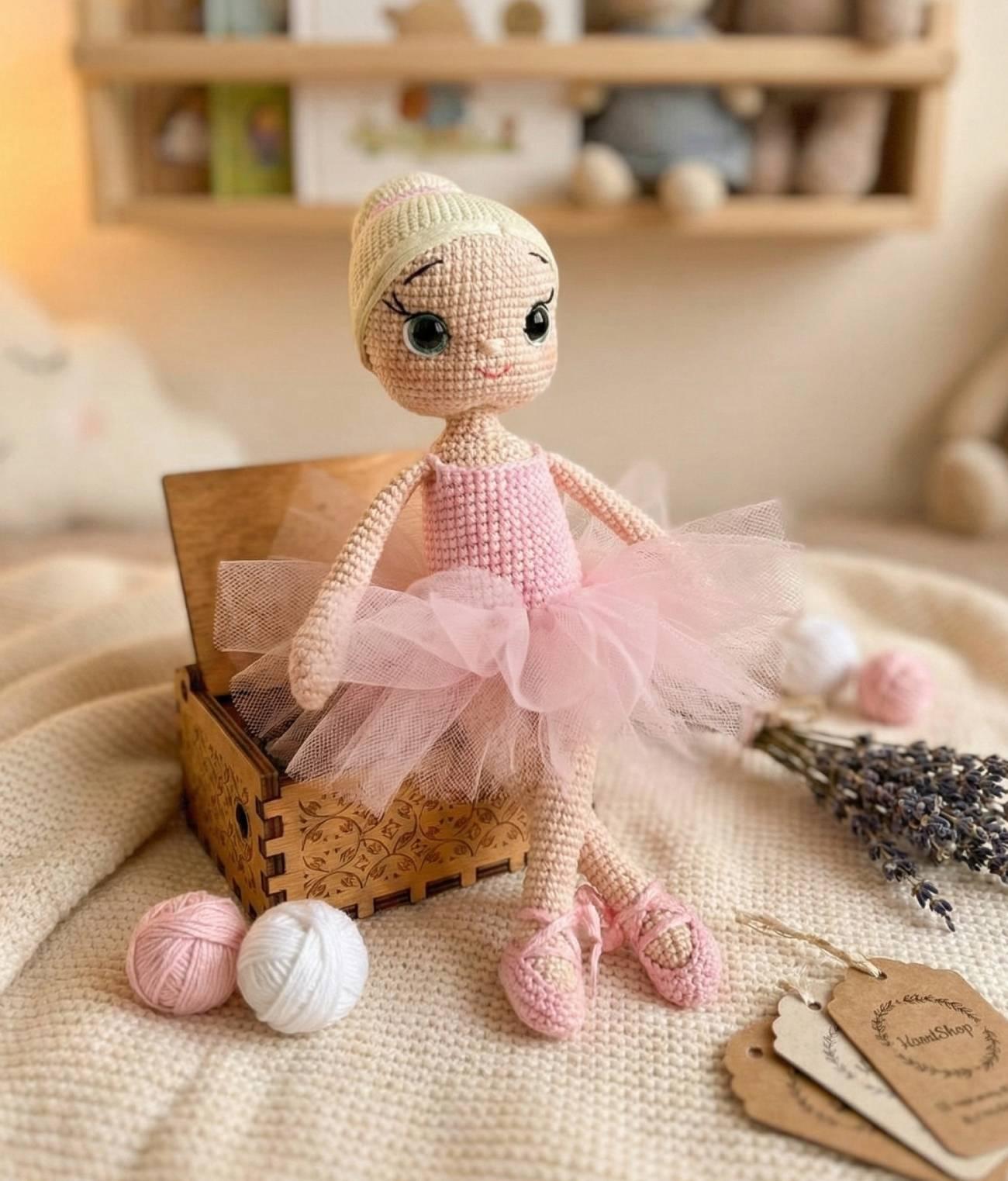 Особливості: велика в’язана лялька крючком – сувенірна іграшка лялька 30 см в образі танцівниці білявки балерини в пуантах та в рожевій пачці. Наша авторська в’язана лялька крючком – ідеальний сувенір та подарунок для любителів мистецтва і балету! Висотою 30 см, ця чудова білявка балерина виконана з великою увагою до деталей. Вона одягнена в стильну рожеву пачку, витончену фатинову спідничку та в’язаний боді, що підкреслюють її елегантний образ. На ногах – пуанти, як у справжньої балерини, а зачіска у вигляді гульки додає ще більше шарму та витонченості. Наша в’язана лялька крючком блондинка баленина – це саме те, що вам потрібно! Створена з любов’ю та увагою до деталей, вона стане чудовим доповненням до вашої колекції. Зробіть ваш подарунок унікальним і неповторним за допомогою цієї красивої, ручної роботи ляльки балеринки, яка приверне увагу і стане чудовим акцентом будь-якої оселі. Придбайте нашу авторську в’язану ляльку балеринку зараз та додайте частинку мистецтва у свій дім!