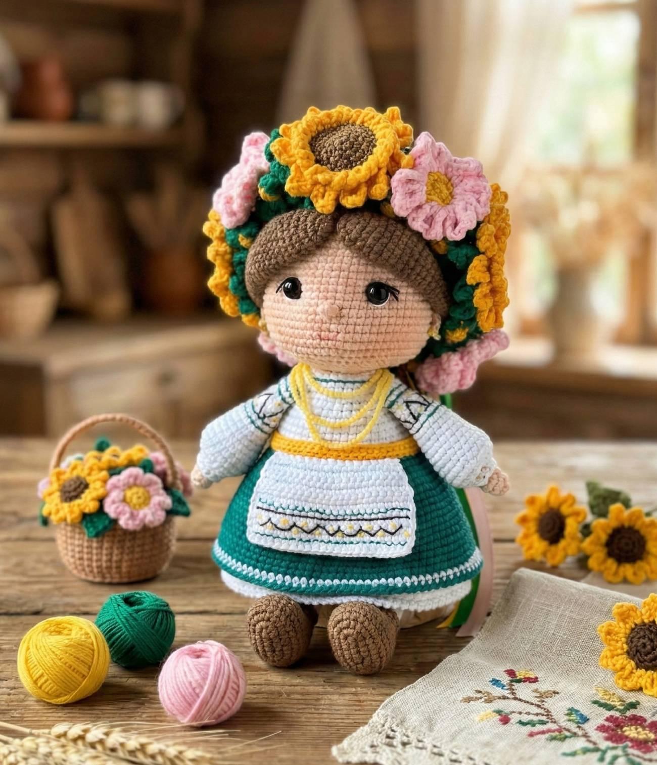 Особливості: сувенірна в’язана лялька крючком – іграшка лялька 23 см в українському національному костюмі, що втілює красу, ніжність і гордість нашого народу. Лялька україночка у довгій сукні вишиванці. Лялька сувенірна українка з об’ємним віночком із польовими квітами – соняшники, рожевими мальвами й різнобарвними довгими стрічками. В’язана крючком іграшка україночка – в’язана лялька у білій сукні з зеленим фартушком – не знімається. У в’язаній лялечці крючком віночок з польовими квітами – не знімається. Очі у лялечки україночки – надійно закріплені, всі деталі міцно пришиті – зафіксовані. У лялечці українці – каштанове волосся з вовни заплетене у косу. Лялька українка виконана в патріотичних кольорах прапору України – стоїть тільки з опорою! Ця лялька-українка – чудовий подарунок, патріотичний сувенір або декоративна прикраса, яка прикрасить будь-який інтер’єр та нагадає про українські традиції. Наша в’язана іграшка лялька створена вручну з любов’ю до України. Кожна лялечка україночка – унікальна!