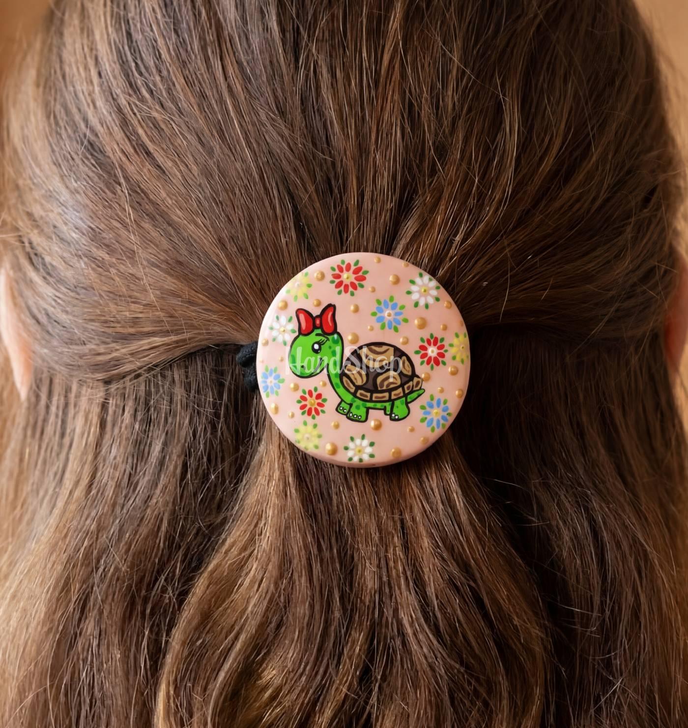 Особливості: прикраси з дерева з ручним розписом – кругла резинка для волосся черепаха діаметром до 5 см в діаметрі. Дитяча резинка черепаха виготовлена вручну з легкого та екологічно чистого дерева липи. Кожен елемент цього стильного аксесуара розписаний вручну акриловими фарбами (нетоксичними, на водній основі), що дозволяє досягти унікального дизайну, а покриття з 6 шарів фінішного фінського лаку надає додаткову міцність і захищає від зовнішніх впливів. Дитяча резинка для волосся – ідеальна для маленьких модниць! Легко збирає волосся в стильний пучок або хвіст, не пошкоджуючи його. наша Авторська резинка черепашка – безпечна для волосся, адже має еластичний матеріал основи, що не травмує волосся і не заплутує його, навіть при щоденному використанні. Цей аксесуар підходить як для дітей, так і для дорослих, адже в ньому поєднуються комфорт, стиль і натуральність. Купуйте нашу резинку для волосся черепашка та додавайте шарм та індивідуальність до вашого повсякденного вигляду!