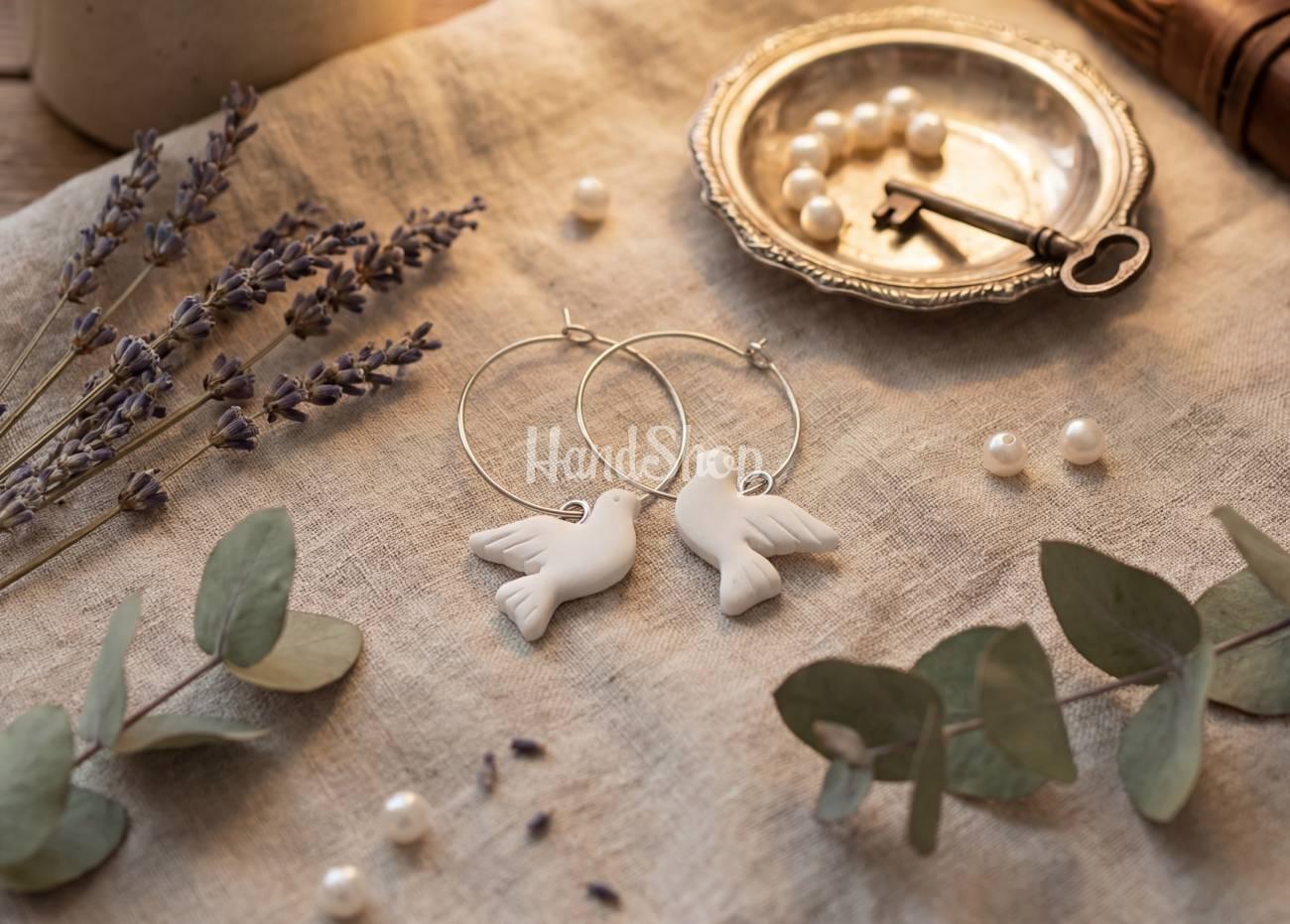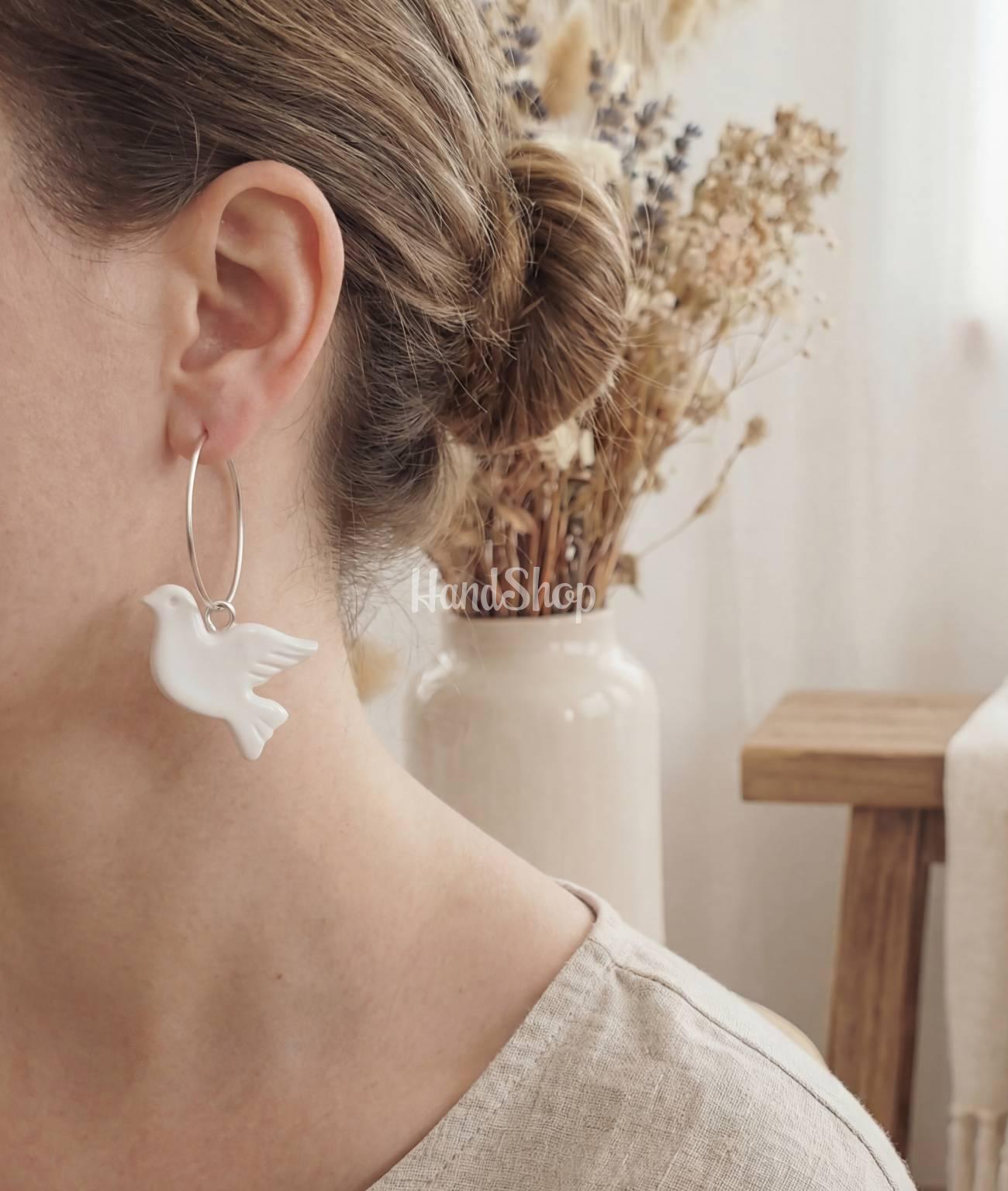 Особливості: прикраси ручної роботи – стильні сережки із полімерної глини з білими горлицями миру. Жіночі білі сережки горлиці 2 х 1,5 см на гіпоалергенній фурнітурі – круглі кільця діаметром до 3 см. Деталізовані білі голубки на кожній сережці символізують мир, гармонію та вірність. Ці прикраси голубки підійдуть як на щоденне носіння, так і для особливих випадків, коли вам потрібно додати образу романтики та ніжності. Кожна голубка виготовлена з особливою увагою до деталей, що робить її не просто прикрасою, а справжнім творінням мистецтва. Полімерна глина дозволяє зберігати природний блиск та кольори протягом тривалого часу. Сережки біла голубка стане чудовим подарунком для близької особи або справжньою прикрасою для вас самих, доповнивши ваш стиль нотками романтики та вишуканості.