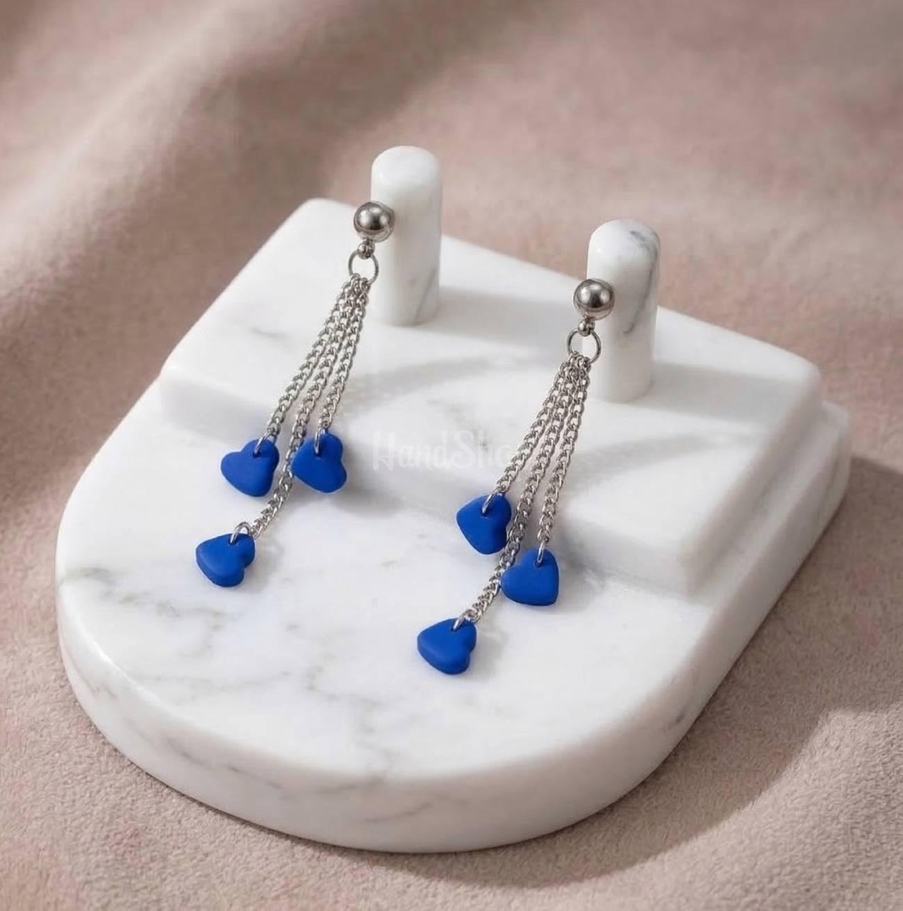 Жіночі довгі сережки сині міні сердечка на ланцюжку глина