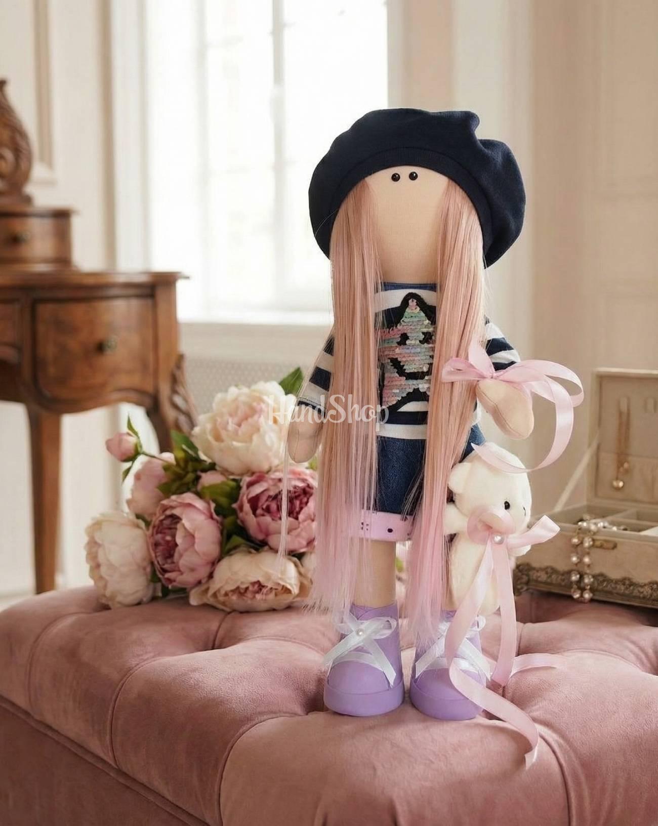 Особливості: інтер’єрна лялька тільда – сувенірна велика авторська інтер’єрна лялька з довгим рожевим амбре волоссям. Сувенірна велика авторська інтер’єрна лялька – справжній витвір мистецтва, який додасть особливого шарму вашому інтер’єру! Висота ляльки тільди – 37 см. Лялька текстильна має розкішне довге рожеве амбре волосся, яке надає образу ніжності та стилю. Маленька модниця в стильній полосатій кофтинці з аплікацією у вигляді зірки та джинсових шортиках виглядає неймовірно чарівно. Лялька має в руках прив’язану іграшку маленького ведмедика – знімається. Чорна текстильна шапочка-берет доповнює її образ, а одяг та туфельки не знімаються, що робить ляльку ще більш елегантною. Ця лялька стоїть самостійно без опори, що є свідченням високої якості її виконання. Вона стане чудовим подарунком або елементом декору для вашого дому, створюючи атмосферу затишку та стилю. Лялька текстильна інтер’єрна ігрова – створена для Вас! Інтер’єрна лялька з рожевим волоссям – зроблена своїми руками, з частинкою душі та теплим настроєм! Лялька текстильна – це ваш приємний, особливий подарунок!