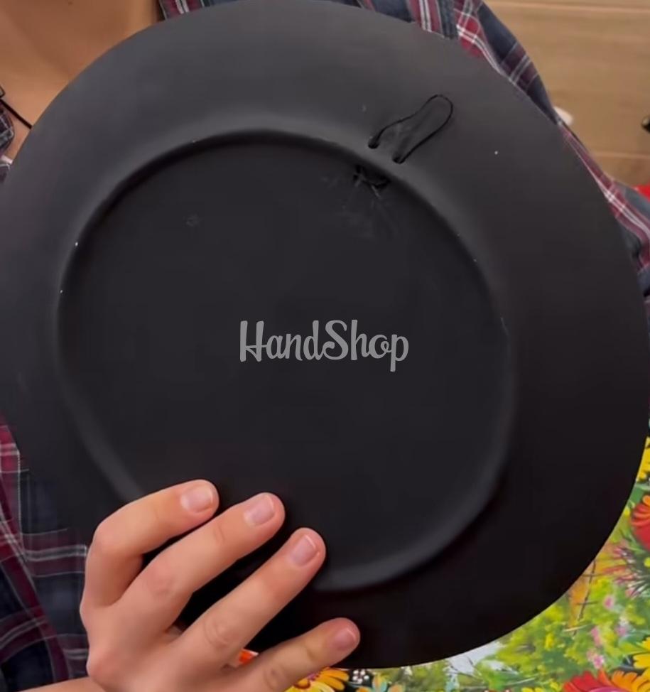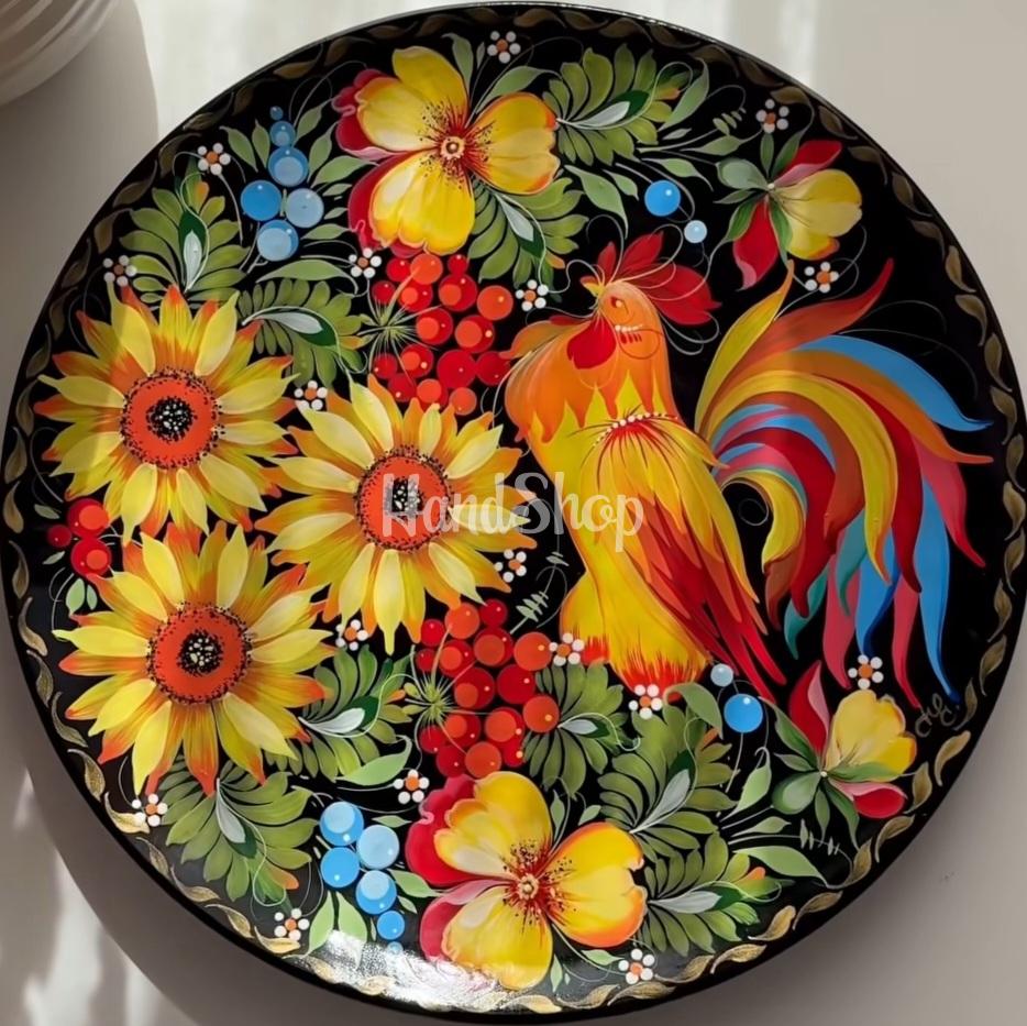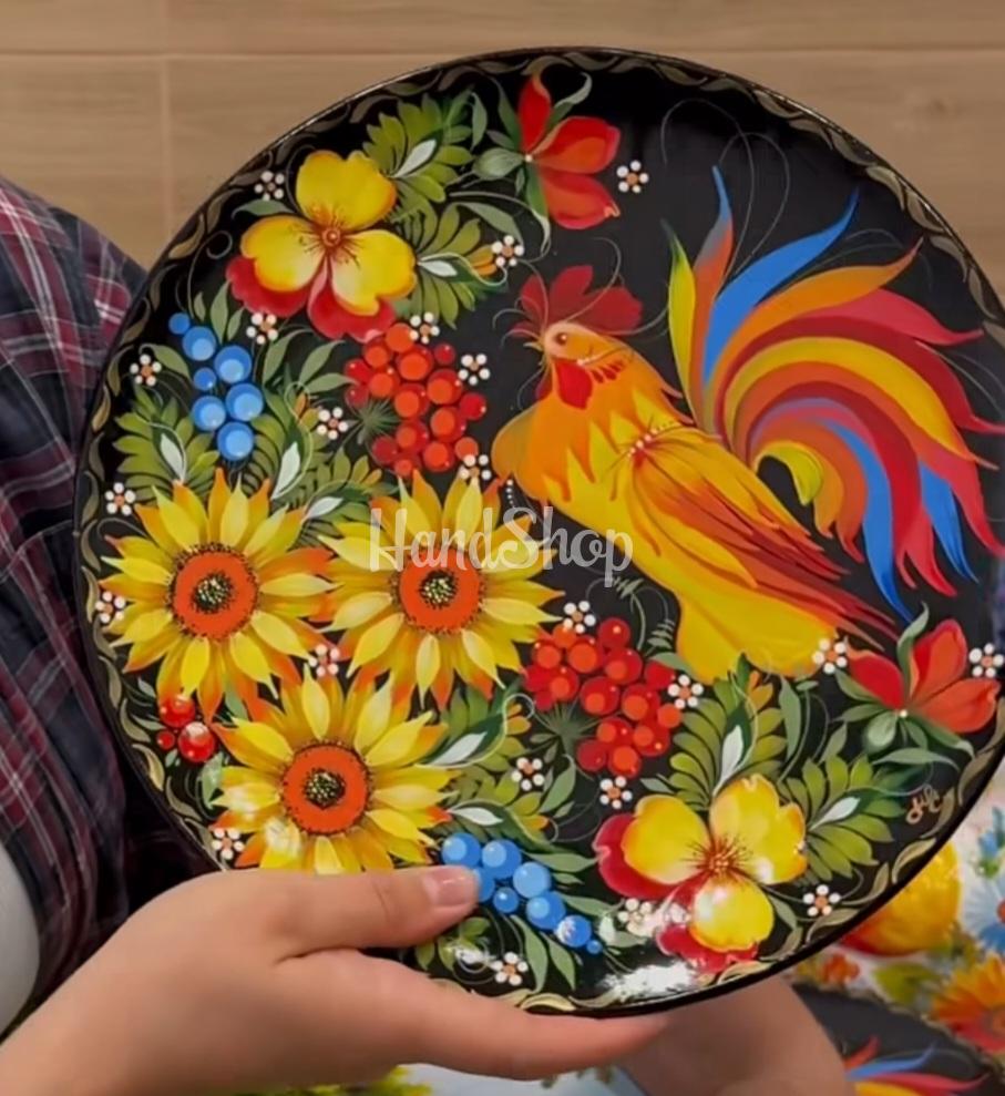 Особливості: авторська керамічна тарілка – кераміка власного виробництва за допомогою сувенірної тарілки панно з петриківським розписом. Велика чорна керамічна тарілка діаметром 27 см – це не просто декоративний елемент, а справжній витвір мистецтва, створений у власній майстерні вручну. Сувенірна чорна керамічна тарілка – це не просто елемент декору, а справжній витвір українського мистецтва. Виготовлена вручну у власній майстерні, вона поєднує традиції народного розпису та сучасну естетику. У центрі композиції тарілки – гордий півень, оточений яскравими українськими квітами: соняхами, анютиними глазками та калиною. Красень півень на тарілці – символ сонця, радості й добробуту. Кожен мазок нанесено вручну у власній майстерні, тому двох однакових виробів не існує. Зворотний бік тарілки має зручну петельку для підвішування, що дозволяє легко розмістити панно на стіні – у вітальні, кухні чи кабінеті. Це не просто сувенір тарілка – це частинка української душі, створена з любов’ю. Контраст яскравих барв на глибокому чорному тлі надає виробу вишуканості й святковості. Ця тарілка з півнем стане чудовим акцентом у вашому інтер’єрі або неповторним сувеніром, що передає душу української культури.