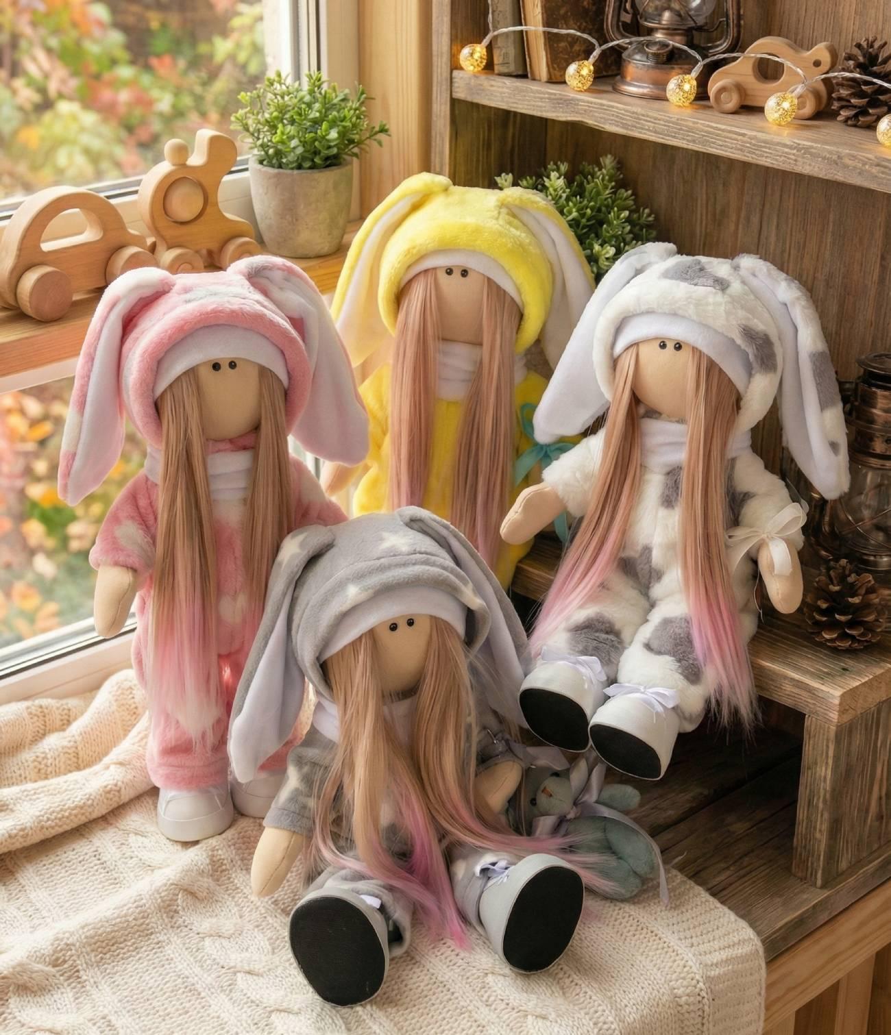 Особливості: інтер’єрна лялька велика новорічна – новорічна красива інтер’єрна лялька до 37 см у різнокольоровому плюшевому комбінезоні з вушками зайки. Лялька зайчик сплюшка із довгим прямим волоссям з рожевим амбре. У ляльці текстильної одяг не знімається! Текстильна інтер’єрна лялька новорічна стоїть та сидить самостійно, без опори! Авторська інтер’єрна лялька новорічна 2026 з м’якою іграшкою – чудовий святковий новорічний подарунок вашим рідним! Авторська тільда інтер’єрна лялька зайка з довгим волоссям – зроблена своїми руками, з частинкою душі та теплим настроєм! Ця лялька тільда стане чудовим доповненням до вашого новорічного декору, а також зворушливим подарунком для малечі та дорослих. Вона може стати чудовим символом тепла і затишку, а її оригінальний вигляд не залишить байдужим нікого. Створіть атмосферу свята разом із цією авторською лялькою зайчиком! Додайте нотку чарівності у вашу оселю чи подаруйте новорічну радість з цією чудовою лялькою!