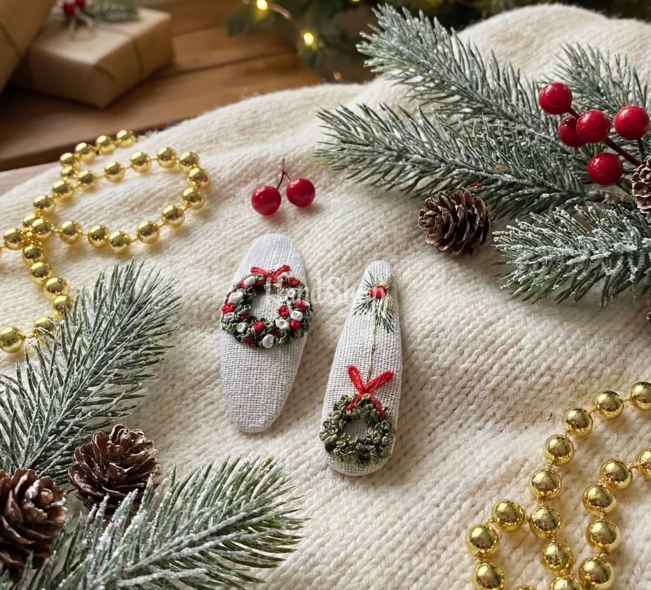Особливості: дитячі аксесуари для волосся з вишивкою ручної роботи – пара заколочок клік-клак для волосся своїми руками з авторською вишивкою різдвяні віночки. Різдвяні віночки на цих заколочках приносять тепло та радість у холодні зимові дні. Вони ідеально доповнять новорічний або різдвяний образ вашої дитини, додаючи святкової магії в її вигляд. Основа заколочок виконана з тканини – натуральний льон. Ручна вишивка новорічних святкових символів виконана з використання шовкових ниток DMC Франція. Ці заколочки з вишивкою новорічних символів стануть справжньою прикрасою для малечі в зимовий період. Дитяча пара заколочок мають металічну основу клік-клак довжиною 6 см. Дитячі заколочки клік-клак з вишивкою ручної роботи – ніжний та стильний аксесуар, що поєднує традиції та сучасний дизайн. Пара заколочок створена своїми руками з натурального льону та прикрашена авторською вишивкою різдвяних віночків. Вишивка заколочок виконана шовковими нитками DMC (Франція), що надає аксесуарам особливого блиску та довговічності. Металева основа клік-клак довжиною 6 см зручно тримається у волоссі, не ковзає та підходить для щоденного носіння й святкових образів. Подаруйте своїй дитині частинку святкової магії з цими чарівними заколочками клік-клак з авторською вишивкою різдвяних віночків! Ці ніжні та стильні аксесуари створені вручну з натуральних матеріалів і ідеально підходять для святкового настрою в зимовий період. Ці вишукані заколочки з вишивкою – це ідеальний вибір для подарунка на свята, будь то день народження, Різдво чи просто для підняття настрою. Вони підкреслять індивідуальність вашої малечі і подарують їй особливе відчуття свята. Подаруйте своїй дитині ці чарівні заколочки різдвяні віночки і створіть святковий настрій, який буде зігрівати у будь-яку пору року!