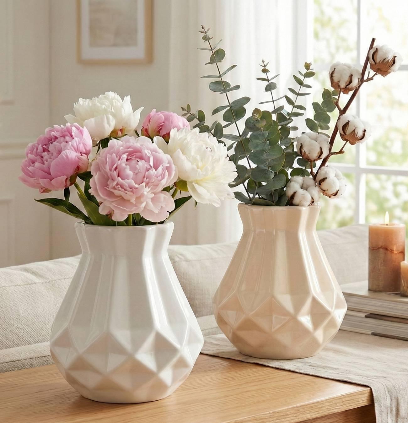 Особливості: ваза порцеляна, фарфор ручна робота – авторська ваза для квітів з об’ємними декоративними ромбами. Велика ваза подарункова фарфор в ніжно-молочному кольорі з об’ємним геометричним малюнком. Ваза для квітів в мінімалістичному стилі з розмірами – висота 16 см, та діаметр до 12 см. Ця ваза з порцеляну, фарфору – витвір мистецтва, який стане справжньою окрасою будь-якого інтер’єру. Кожен ромб на поверхні вази – це ручна робота майстра, який зіткнув тонкі пластинки порцеляну, утворивши цей елегантний образець. Ваза ідеально підійде для розкішного букету квітів або окремо стоячих квіток, додаючи краси та вишуканості в будь-яку кімнату. Незвичайний дизайн вази забезпечить оригінальний декор будь-якого заходу. Ця велика подарункова порцелянова ваза стане стильним акцентом у вітальні, спальні чи кабінеті, а також вишуканим подарунком для поціновувачів мистецтва, дизайну та унікальних інтер’єрних речей. Обираючи цю вазу, ви обираєте індивідуальність, якість і красу, створену руками майстра. Ваза з порцеляни ручної роботи – це не просто посуд для квітів, а справжній витвір мистецтва, створений для поціновувачів естетики та мінімалізму.