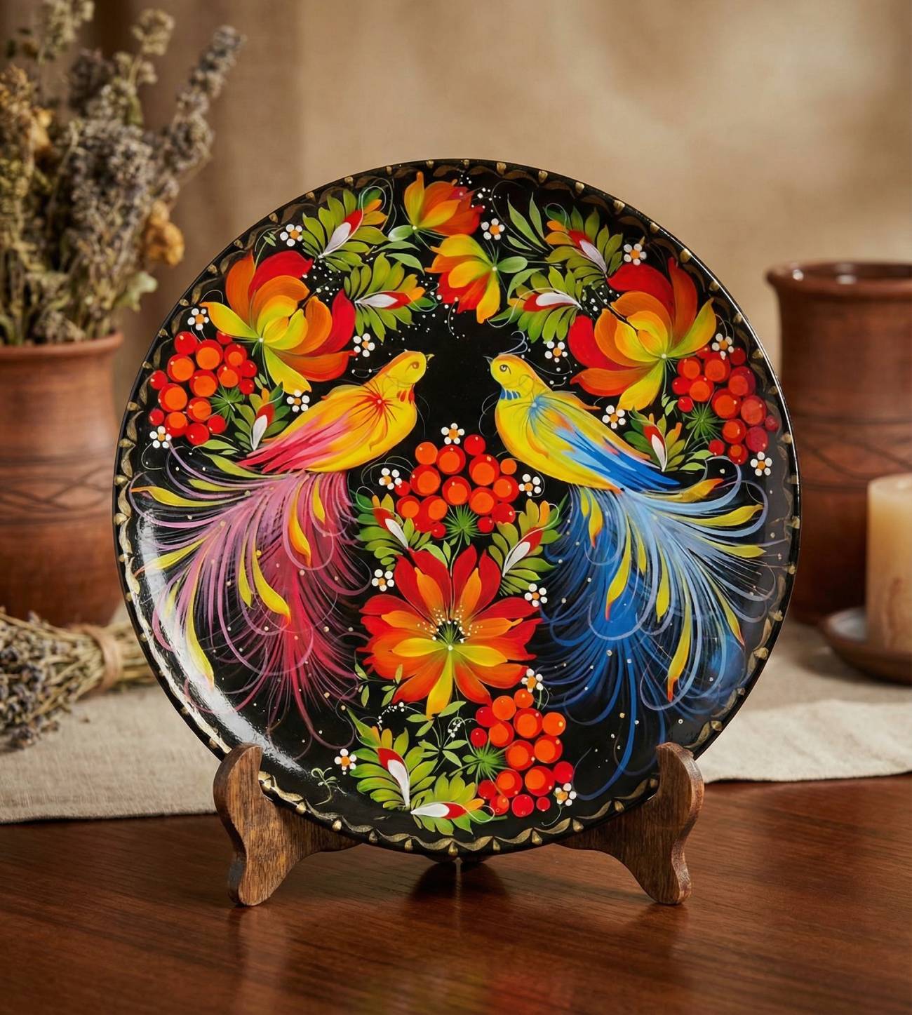 Особливості: авторська керамічна тарілка – кераміка власного виробництва за допомогою сувенірної тарілки панно з петриківським розписом. Велика чорна керамічна тарілка діаметром 27 см – це не просто декоративний елемент, а справжній витвір мистецтва, створений у власній майстерні вручну. У центрі композиції керамічної тарілки – пара птахів серед українських квітів мальв та калини, що символізують любов, згоду та благополуччя в будинку. Яскравий петриківський розпис на глибокому чорному тлі тарілки виглядає особливо ефектно: кожен мазок пензля додає витонченості та живої енергії виробу. Квіткові орнаменти на тарілці, виконані у традиційній техніці, немов оживають, створюючи гармонію кольорів та форм. Зворотний бік тарілки має зручну петельку для підвішування, що дозволяє легко розмістити панно на стіні – у вітальні, кухні чи кабінеті. Чорна кругла тарілка з петриківським розписом чудово поєднує традиції українського народного мистецтва та сучасний естетичний смак.