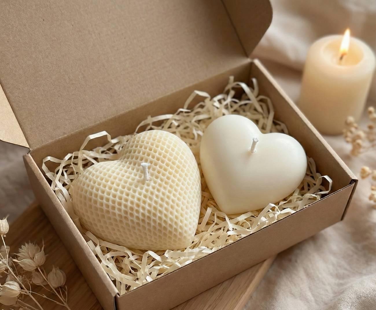 Особливості: авторські вироби з воску – набір з двох свічок сердечок в кремовому кольорах та цікавих текстурах, які стануть ідеальним акцентом для затишного вечора або особливого подарунка. Свічка сердечко з текстурою ромби кремового кольору – 10 х 9 см, вага 170 г, час горіння до 7 годин. Свічка біле гладке серце – 7,7 х 6,5 см, вага 90 г, час горіння до 5 годин. Кожна свічка у формі кремового сердечка виготовлена повністю вручну з натурального соєвого воску. Особлива деталь – аромат на ваш вибір свічки. Під час ЗАМОВЛЕННЯ ВИ САМОСТІЙНО ОБИРАЄТЕ АРОМАТ, який наповнить простір теплом, ніжністю або пристрастю саме у вашому стилі. Цей романтичний набір свічок сердець наповнуватиме кімнату атмосферою тепла та затишку.