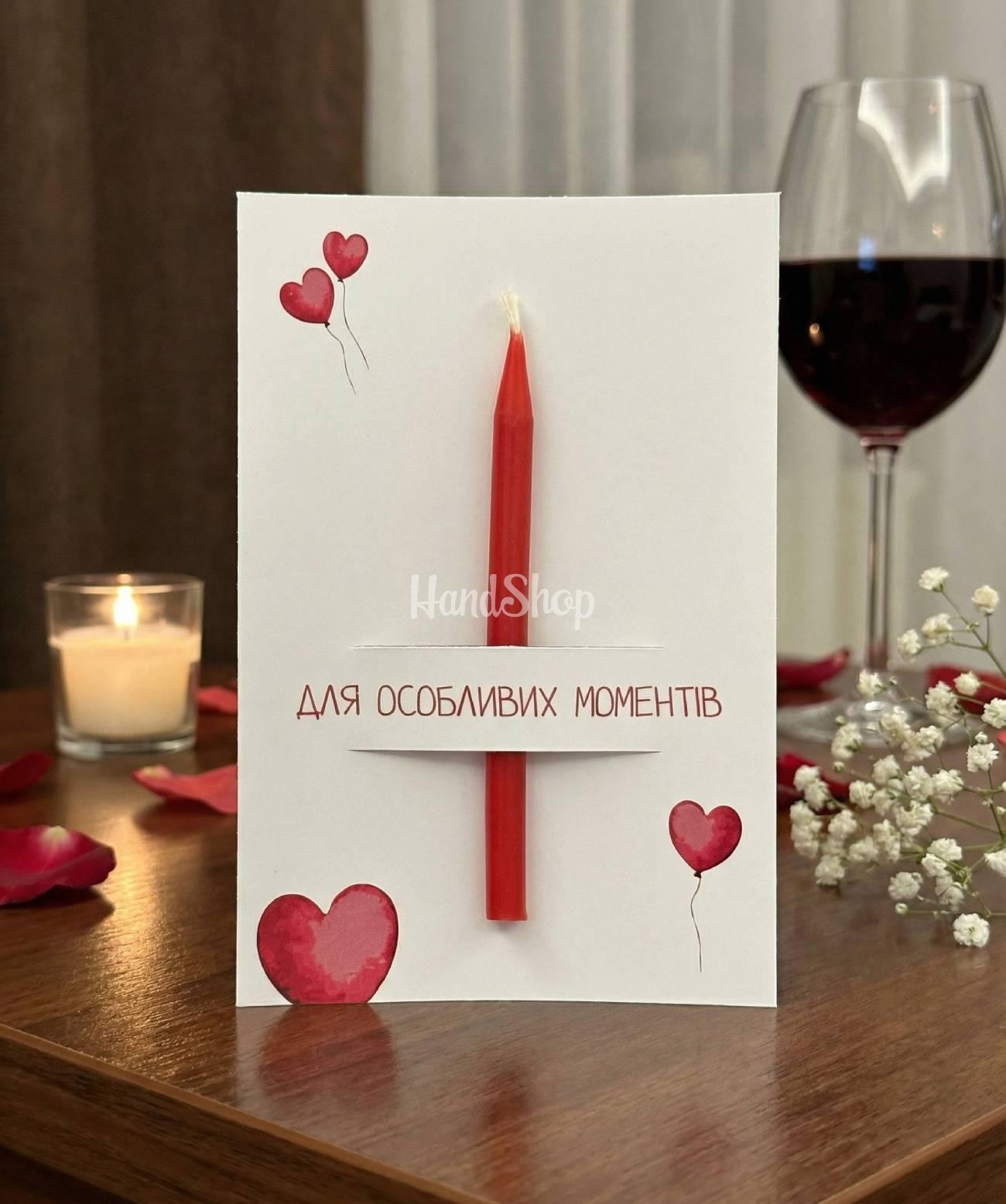 Особливості: святкові атрибути – романтична вітальна авторська листівка маленького формату 12 х 8 см. Вітальна листівка має прорізне віконечко, через яке видніється довга свічка бенто-олівець ручної роботи 9 см та та 0,5 см в діаметрі, виготовлена з натурального віску, в червоному кольорі, що додає чарівної атмосфери. На зворотному боці листівки є спеціальна смужка сірки – чиркало, а також сірник, закріплений на кольоровий скотч, щоб отримати ідеальну відповідь на будь-яке свято. Дизайнерський картон, на якому виготовлена листівка, підкреслює її елегантність. На лицьовій стороні ви знайдете зображення закоханої пари, що обмінюється сердечками, а напис «Для особливих моментів» на українській мові надає листівці глибокого емоційного змісту. Ця романтична листівка зі свічкою стане чудовим подарунком для коханої людини, яка оцінить її витонченість і теплоту. Унікальність дизайну та майстерність виготовлення роблять її ідеальним варіантом для найкращих моментів вашого життя.