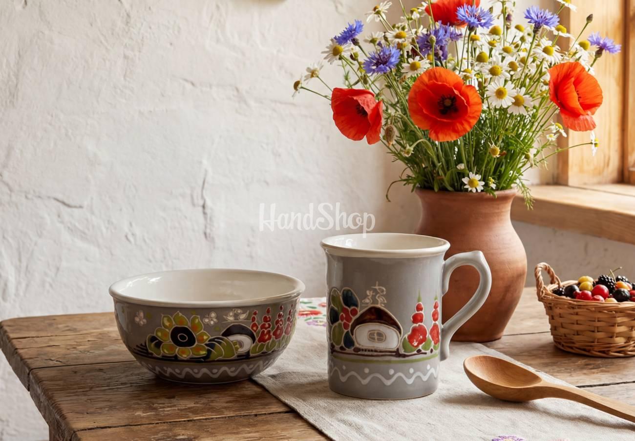Особливості: керамічний посуд – сувенірний святковий набір чашка 300 мл та миска 450 мл з ручним розписом в сірому кольорі – квіти українські мальви, лелеки, хатинки, соняхи – українське село. Керамічна чашка ручної роботи та керамічна миска виконані в квітковому стилі. Шукаєте ідеальний подарунок, який буде не лише красивим, а й несе в собі глибокий сенс? Пропонуємо вам сувенірний святковий набір, що поєднує в собі традиційну українську красу та витонченість. Набір складається з чашки 300 мл та миски 450 мл, які виготовлені вручну з кераміки та розписані в унікальному квітковому стилі. Ручний розпис чашки з розмірами: діаметр мм: 85; висота, мм: 90; місткість, мл: 300. Керамічна миска з розмірами: діаметр мм: 135; висота, мм: 60; місткість, мл: 450. Керамічний набір посуду вражає своєю витонченістю та гармонійною композицією. Кожен елемент розпису – це маленька історія, що переносить нас у серце українського села. Мальви та соняхи символізують красу природи, лелеки – повернення до дому, а хатинки нагадують про теплоту рідного порогу. Така чашка та миска перетворюються на не просто предмети, а на справжній витвір мистецтва, який дарує затишок та спокій. Цей сувенірний набір посуду – чудовий варіант для подарунка на будь-яке свято. Завдяки ручному розпису, кожен набір є унікальним і має свою неповторну атмосферу. Подаруйте рідним або друзям частинку української культури, яка буде не лише прикрасою їхнього дому, а й нагадуванням про коріння, традиції та теплоту родинного вогнища.