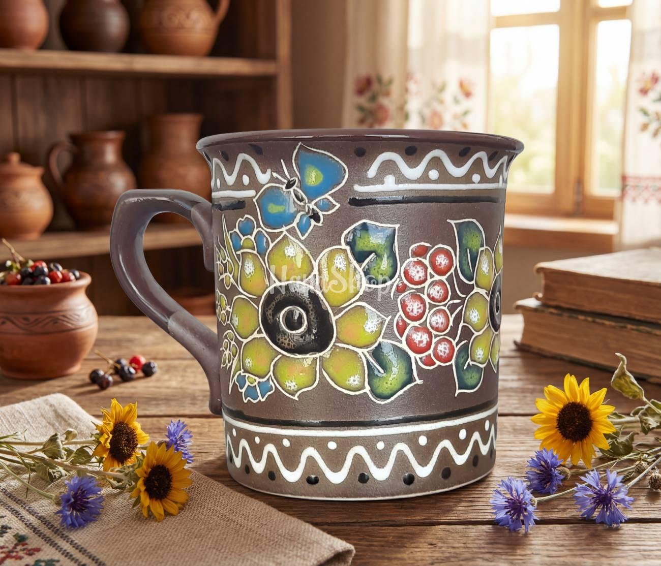 Особливості: керамічний посуд – авторська сувенірна чашка 300 мл з ручним розписом. Керамічна чашка ручної роботи, виконана в українському стилі, стане справжньою окрасою вашого дому. Чашка виконана в традиційному українському стилі, на її поверхні відображені елементи народного мистецтва, які стали символами національної гордості. Яскравий соняшник, що символізує тепло та родючість, гілочки червоної калини – як символ краси та сили, а також метелик, що уособлює легкість і свободу. Чашка з глини з розмірами: діаметр мм: 85; висота, мм: 90; місткість, мл: 300. Ця авторська керамічна чашка соняхи об’ємом 300 мл з ручним розписом – справжній витвір мистецтва, який додасть вашій оселі особливого шарму. Кожен виріб виготовлений вручну, що робить кожну чашку унікальною і неповторною. Цей чудовий предмет – керамічна чашка соняшники стане чудовим подарунком для близьких або стане прикрасою вашої кухні чи робочого простору. Кожен ковток з такої чашки соняшники кераміка приносить не тільки насолоду, а й частинку української культури та традицій. Подаруйте собі або своїм близьким частинку українського мистецтва, яка радуватиме щодня!
